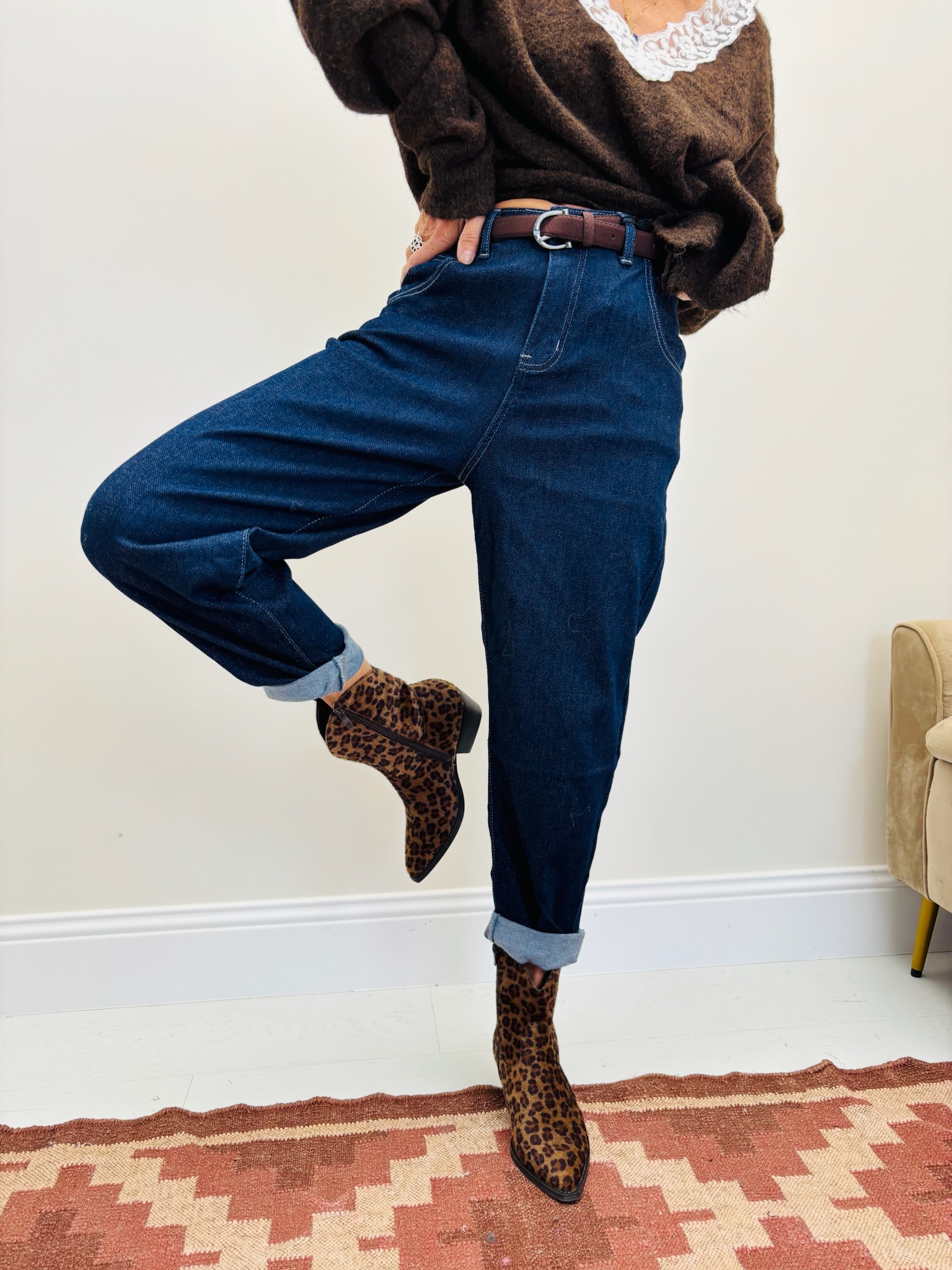 Ce jean à la coupe barrel (légèrement ballon au niveau des jambes et resserré aux chevilles) allie style et confort. Réalisé dans une toile denim bleu foncé souple et résistante, il met la silhouette en valeur tout en offrant une grande aisance de mouvement.