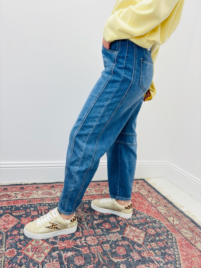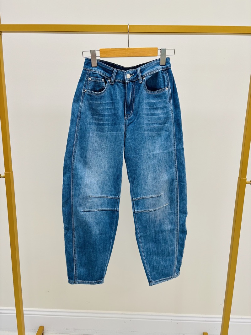 Ce jean coupe barrel est une pièce incontournable pour une collection denim actuelle. Sa taille haute met la silhouette en valeur tandis que sa forme arrondie sur la jambe, légèrement ample au niveau des cuisses puis resserrée en bas, crée un volume moderne et très mode. C’est une coupe ultra-tendance, appréciée pour son confort et son style affirmé.
