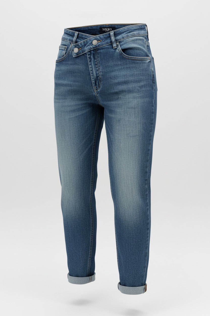 La taille est structurée par une fermeture asymétrique à double bouton, détail mode qui apporte une vraie originalité et souligne joliment la taille. Le denim présente un délavage bleu intemporel, facile à associer et parfaitement adapté à une offre boutique polyvalente, du casual chic au look plus affirmé.