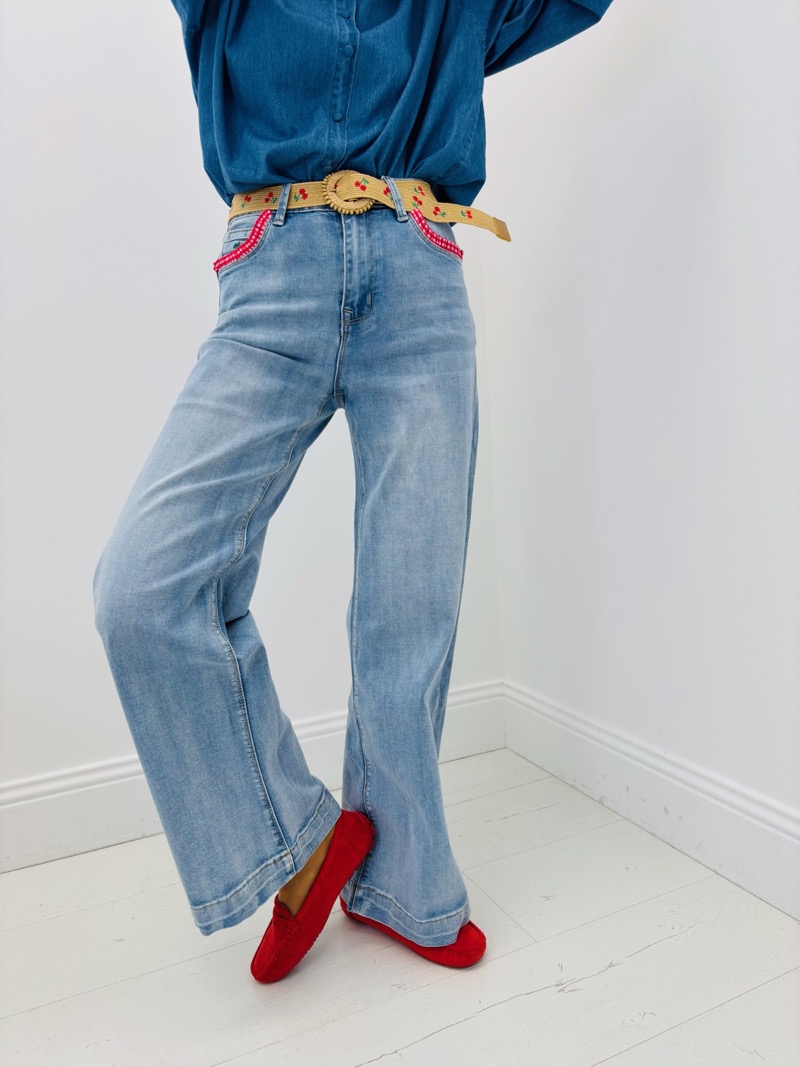La taille haute structure la silhouette et met en valeur la taille, tandis que le denim légèrement délavé offre un rendu authentique et facile à associer. Les poches avant sont subtilement rehaussées de finitions contrastées, apportant un esprit bohème chic et un détail visuel qui fait toute la différence. La ceinture intégrée brodée, avec sa boucle décorative, ajoute une note artisanale et élégante, transformant ce jean en pièce coup de cœur.