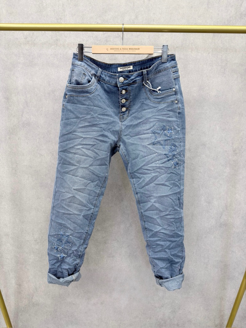 Les motifs étoiles avec strass délicats positionnés sur la jambe apportent une touche décorative discrète mais élégante, idéale pour dynamiser un look quotidien. Ce modèle combine ainsi confort, style et originalité, tout en restant facile à porter.