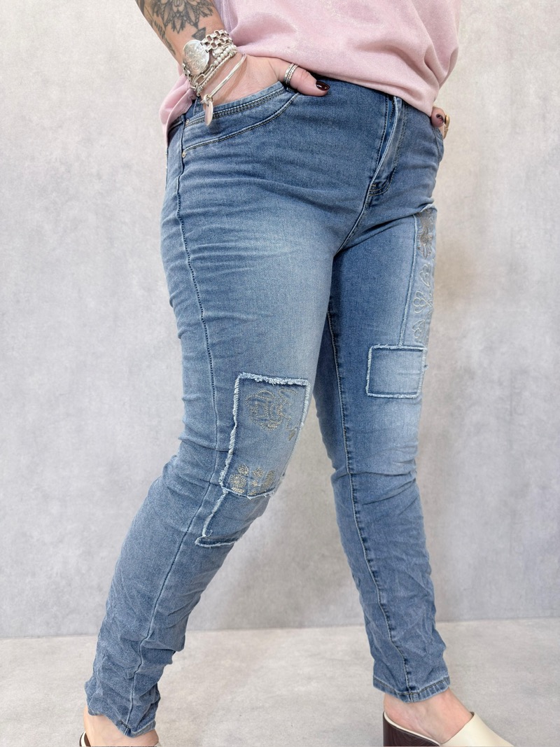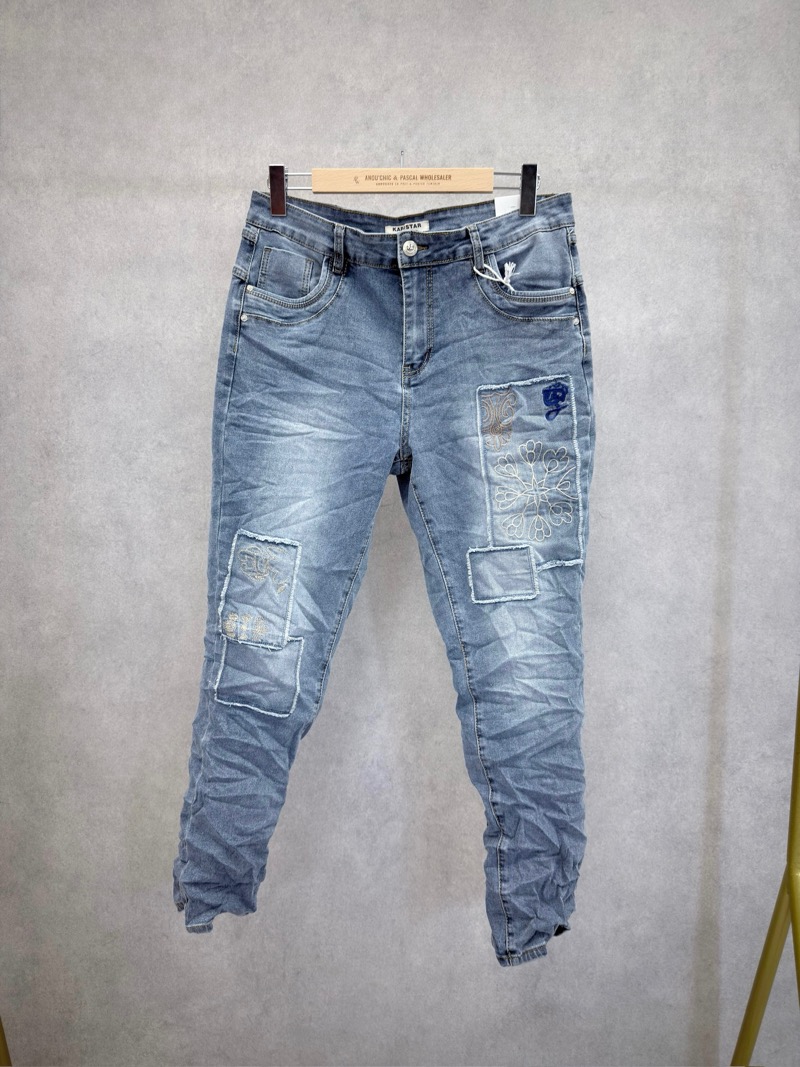 Associé à un t-shirt basique, une blouse fluide ou un top casual, ce jean crée une silhouette moderne et dynamique. Les détails patchwork et brodés apportent une touche mode qui attire le regard sans être trop marquée.