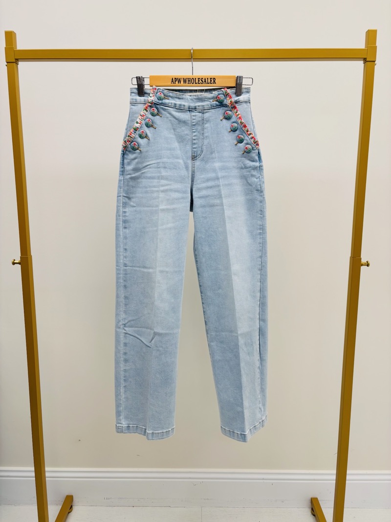 Le détail signature de ce modèle réside dans ses broderies fleuries délicates le long des poches, inspirées de l’esprit liberty. Ces finitions colorées apportent une note romantique et raffinée, tout en restant discrètes et faciles à associer. Le délavage bleu clair renforce l’aspect doux et lumineux du jean, parfait pour la saison printemps-été.