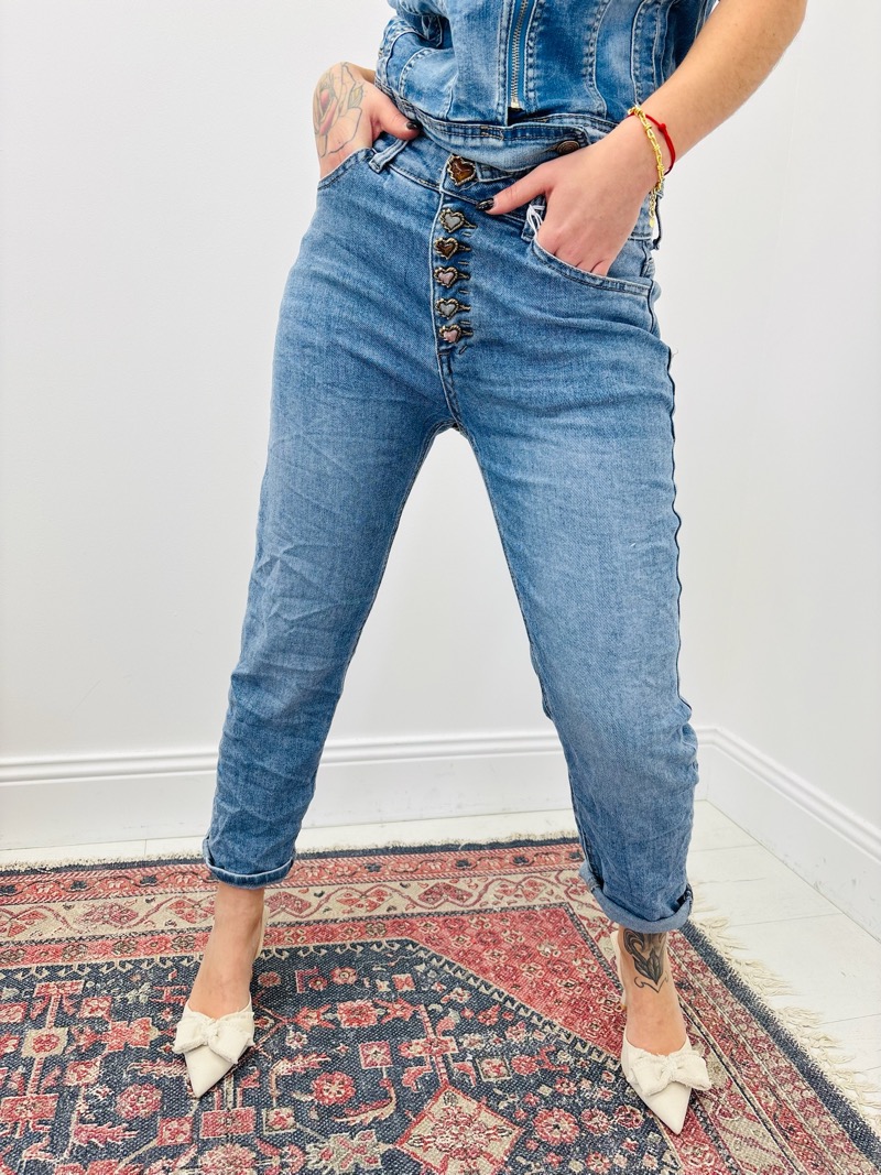 La particularité de ce modèle réside dans sa fermeture à boutons décoratifs en forme de cœur, disposés sur le devant. Ces boutons bijoux apportent une note féminine et raffinée, tout en conservant l’authenticité du jean. Ils deviennent un véritable élément de style, visible aussi bien avec un top rentré qu’avec une chemise légèrement ouverte.