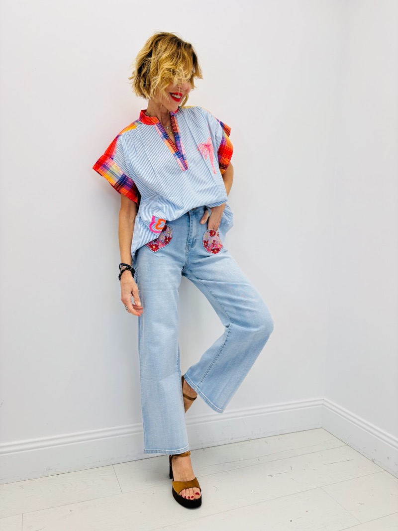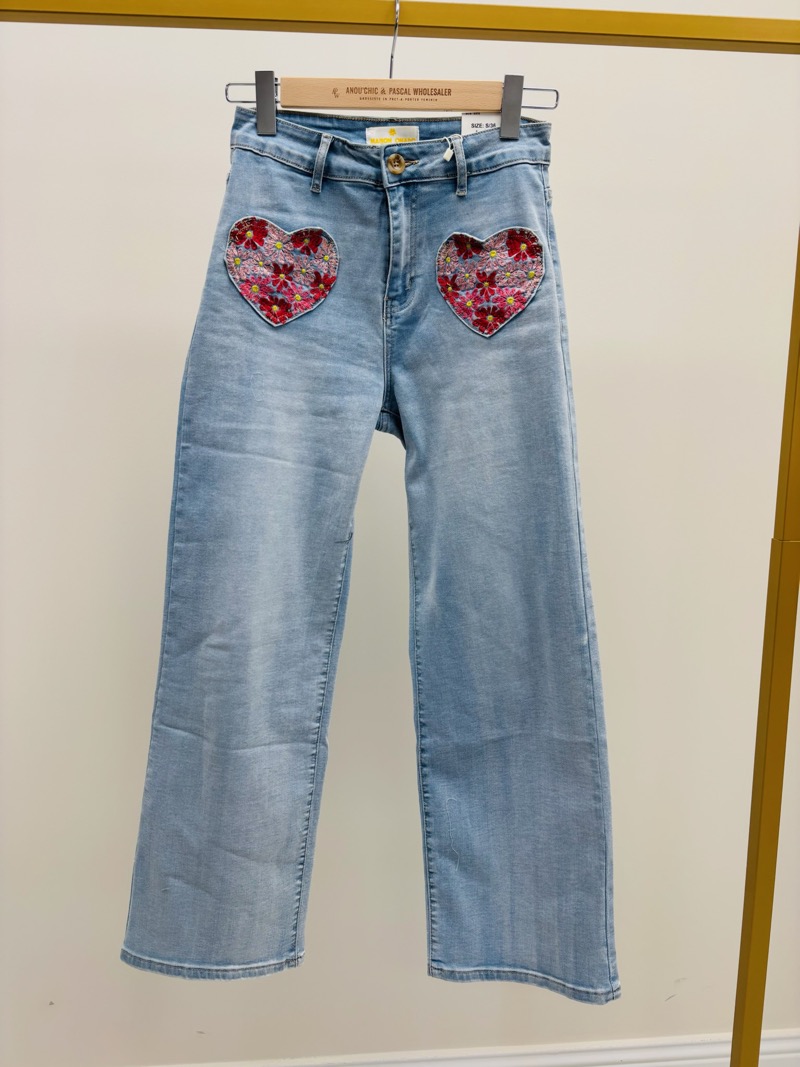 Découvrez notre jean coupe wide leg avec des poches en forme de cœur brodées. Parfait pour un look casual avec une touche unique.