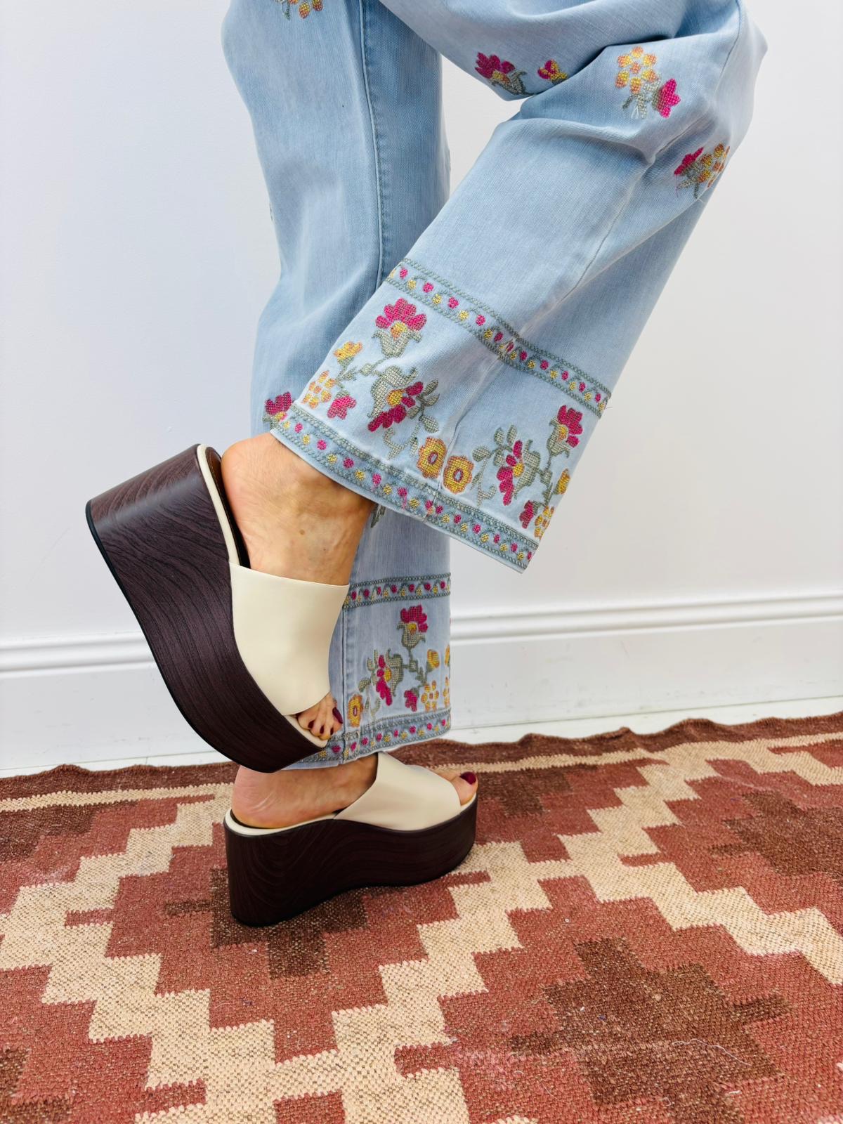 Ce jean coupe wide leg revisite le denim classique avec une touche artisanale et féminine. Confectionné dans une toile denim bleu clair légèrement délavée, il se distingue par ses délicates broderies florales colorées réparties sur l’ensemble de la jambe ainsi que par une frise brodée subtilement travaillée en bas de pantalon.