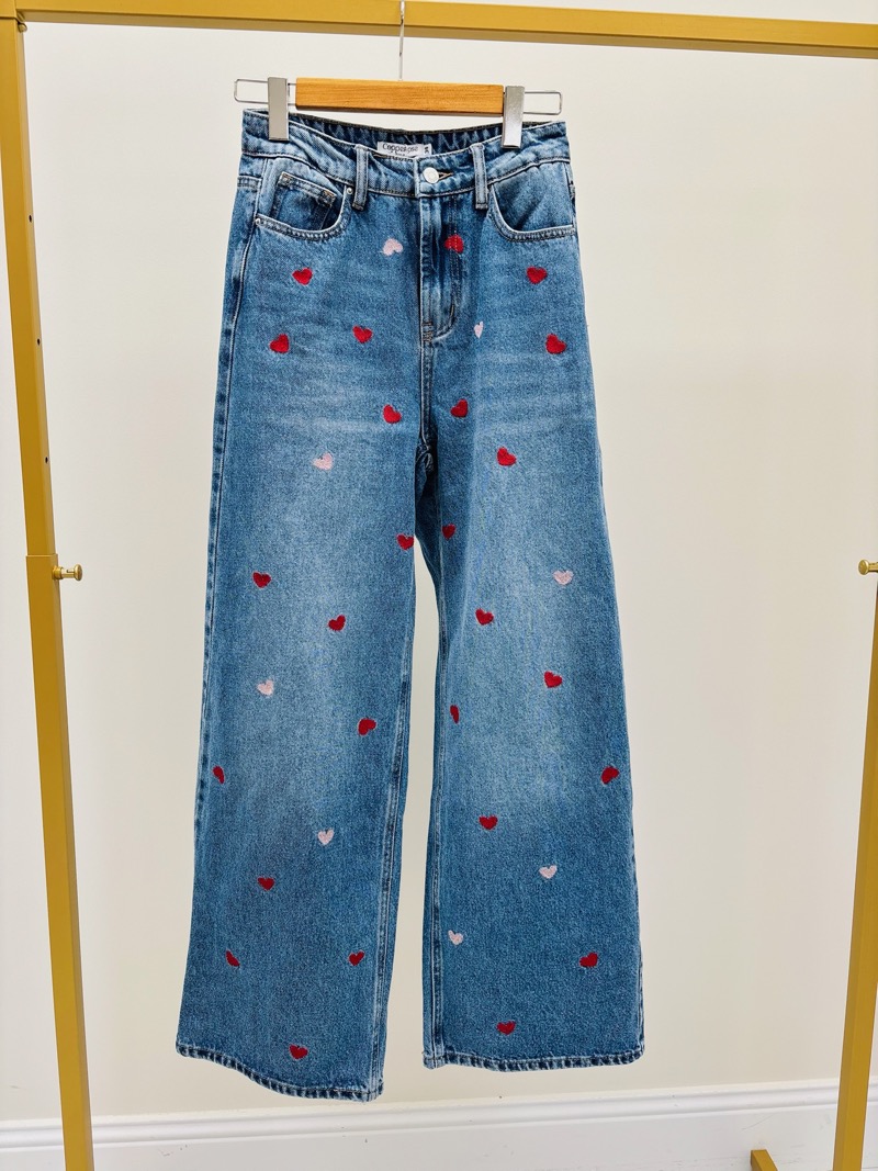 Jean Wide Leg Broderies Cœurs Rouge Et Rose