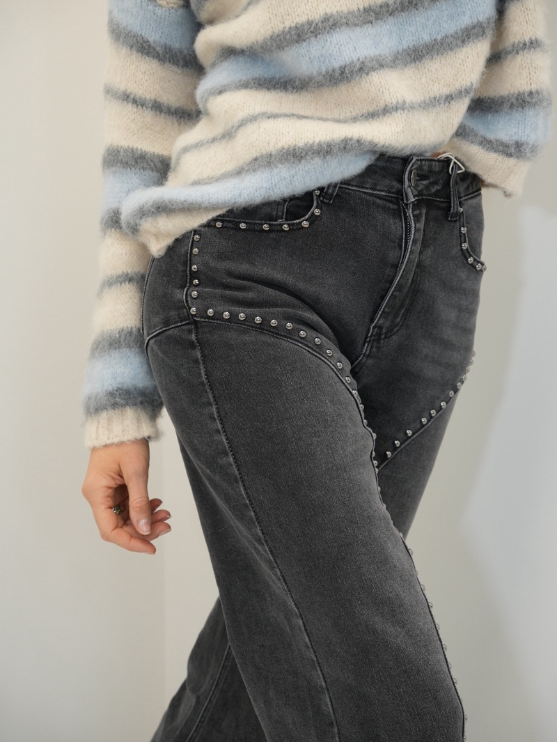Porté avec un gilet perlé élégant, le jean clouté crée un contraste parfait entre douceur féminine et touche rock chic.