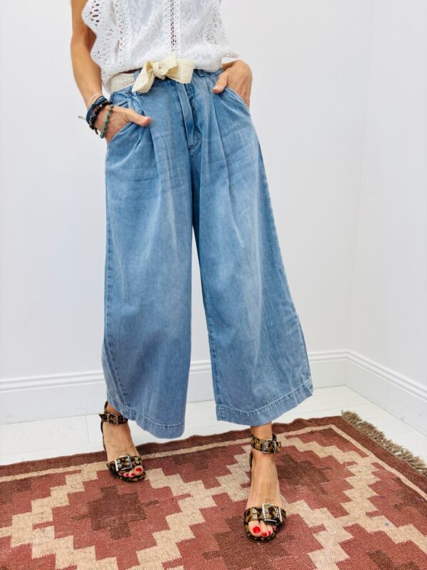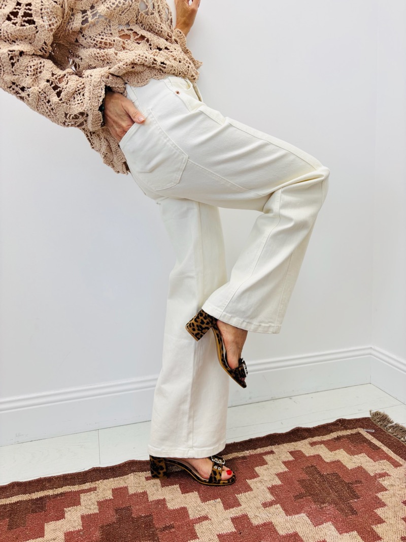 Sa coupe wide leg, droite et légèrement évasée à partir de la cuisse, allonge naturellement la jambe et apporte une allure élégante. La taille haute souligne la silhouette et assure un maintien parfait. Le modèle est proposé en deux déclinaisons essentielles : denim bleu légèrement délavé pour un esprit casual chic, et blanc lumineux pour une silhouette plus raffinée et estivale.