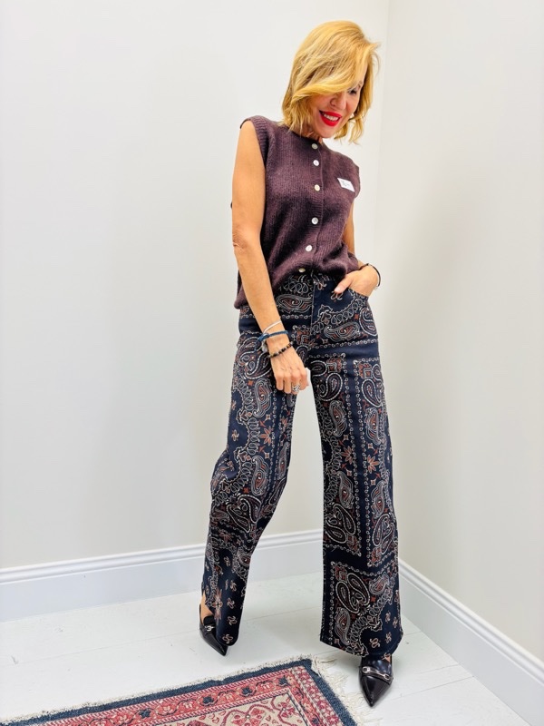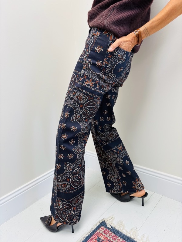 Un jean original et tendance qui revisite la coupe wide leg avec un imprimé cachemire raffiné. Sa coupe évasée assure confort et élégance, idéale pour un look à la fois chic et décontracté.