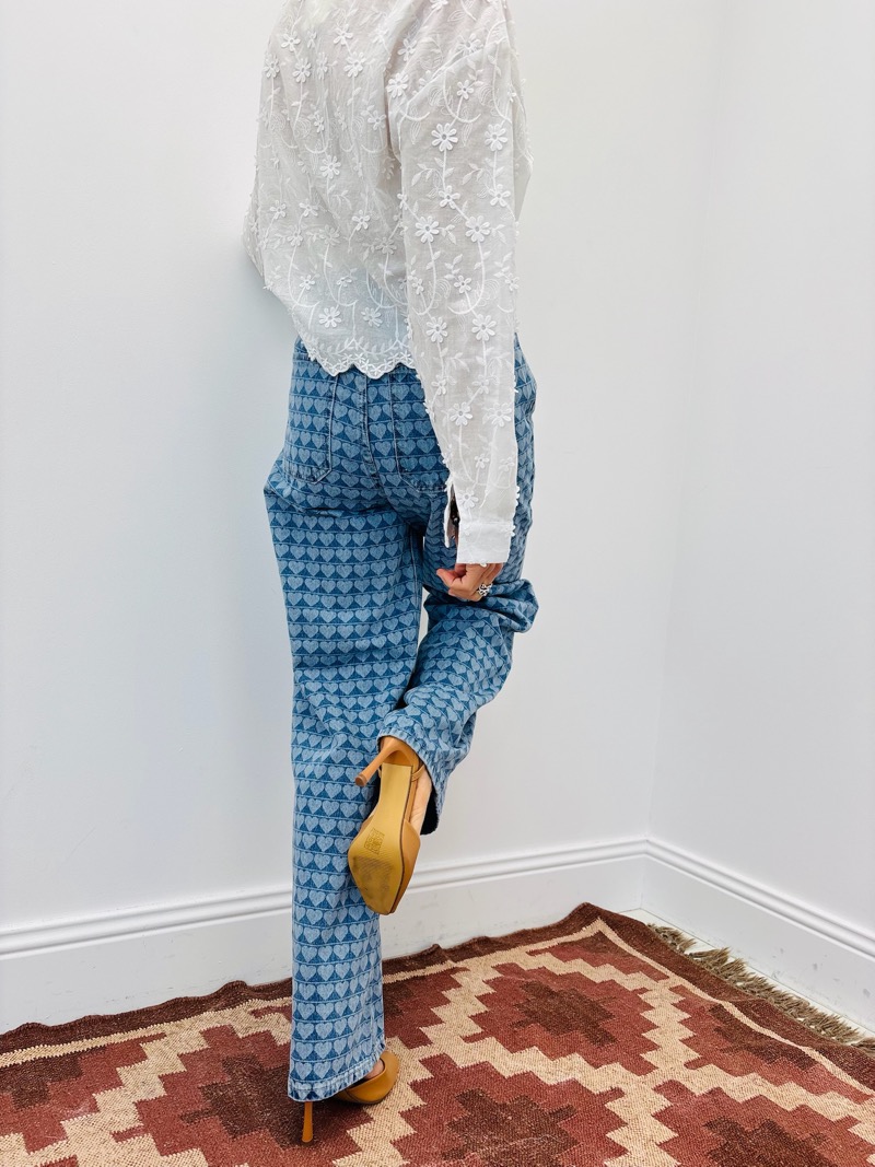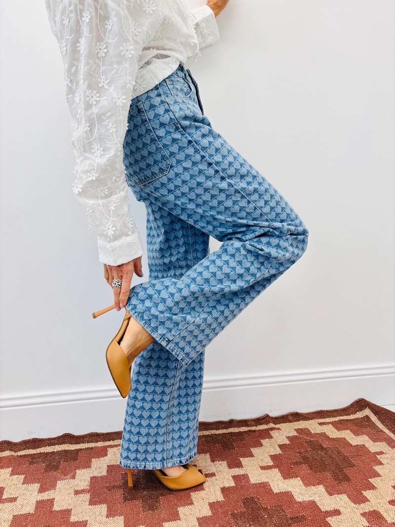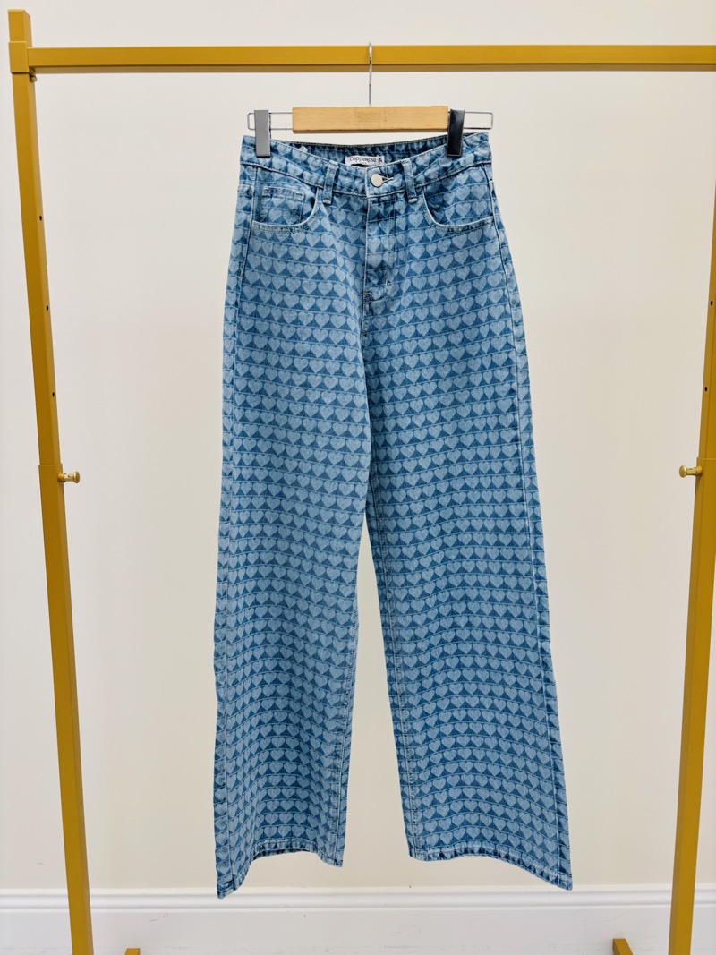 Tendance, audacieux et résolument mode, ce jean wide leg à motif cœur revisite le denim classique avec une touche graphique ultra féminine. Son imprimé all-over composé de petits cœurs ton sur ton apporte du relief et une vraie signature visuelle, tout en restant facile à porter.