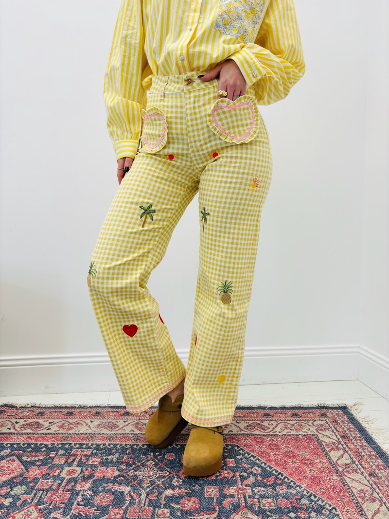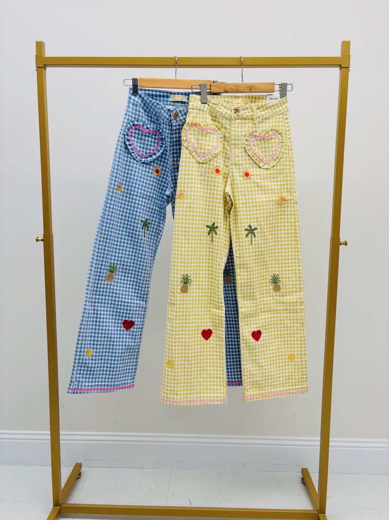 Le véritable atout de ce jean réside dans ses broderies fantaisie : cœurs, palmiers, fruits et petits motifs colorés viennent ponctuer le pantalon avec subtilité et créativité. Les poches arrière en forme de cœur, bordées d’un liseré contrasté, ajoutent une signature mode forte et différenciante, parfaite pour se démarquer en boutique. Les finitions au bas de jambe apportent une touche soignée et artisanale.