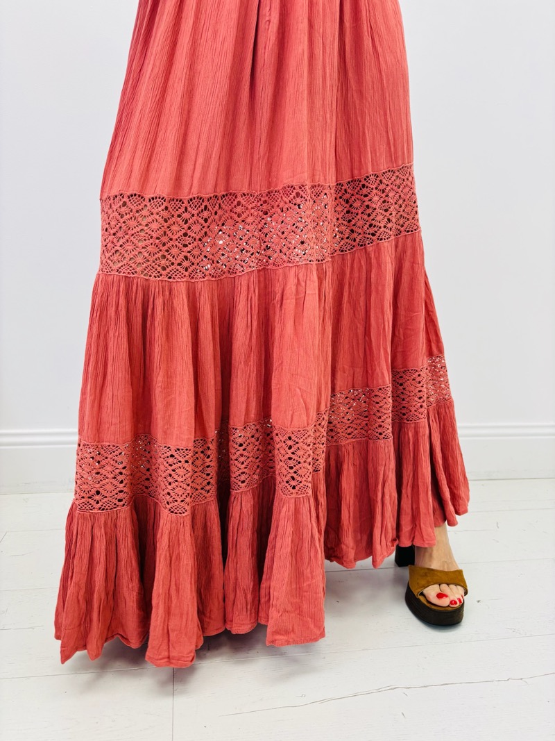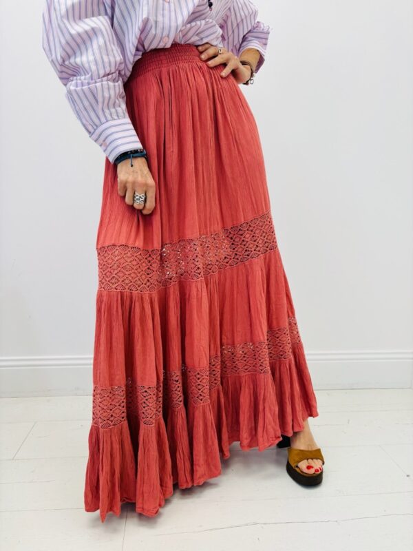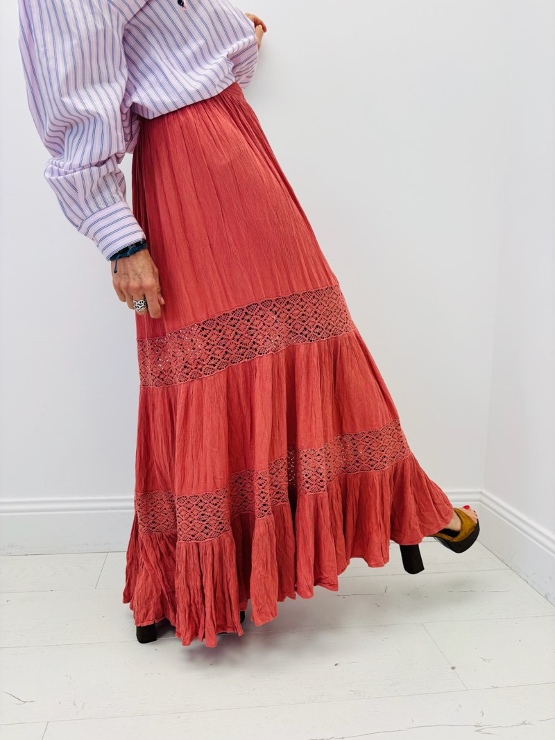 Cette jupe est parfaite pour un look bohème chic, associée à un haut léger et des sandales.