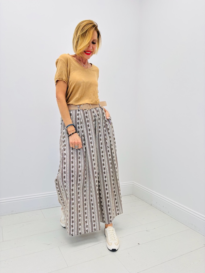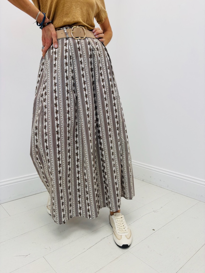 Craquez pour cette jupe longue imprimée liberty, une pièce féminine et intemporelle qui séduit par son allure élégante et naturelle. Son motif fleuri délicat associé à des rayures fines apporte un style à la fois romantique et moderne, idéal pour la saison printemps/été.