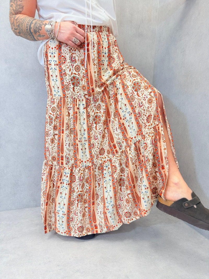 À porter avec un t-shirt uni, une blouse fluide ou un top près du corps pour équilibrer les volumes. Elle s’associe parfaitement à des sandales, des baskets pour un look casual chic, ou des boots pour une allure plus affirmée. Une jupe idéale pour créer des looks bohèmes, féminins et actuels, tout en garantissant confort et élégance.