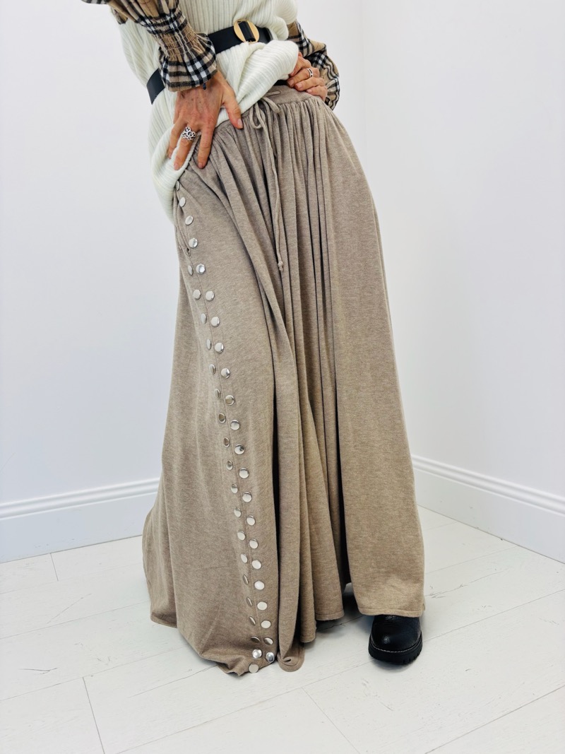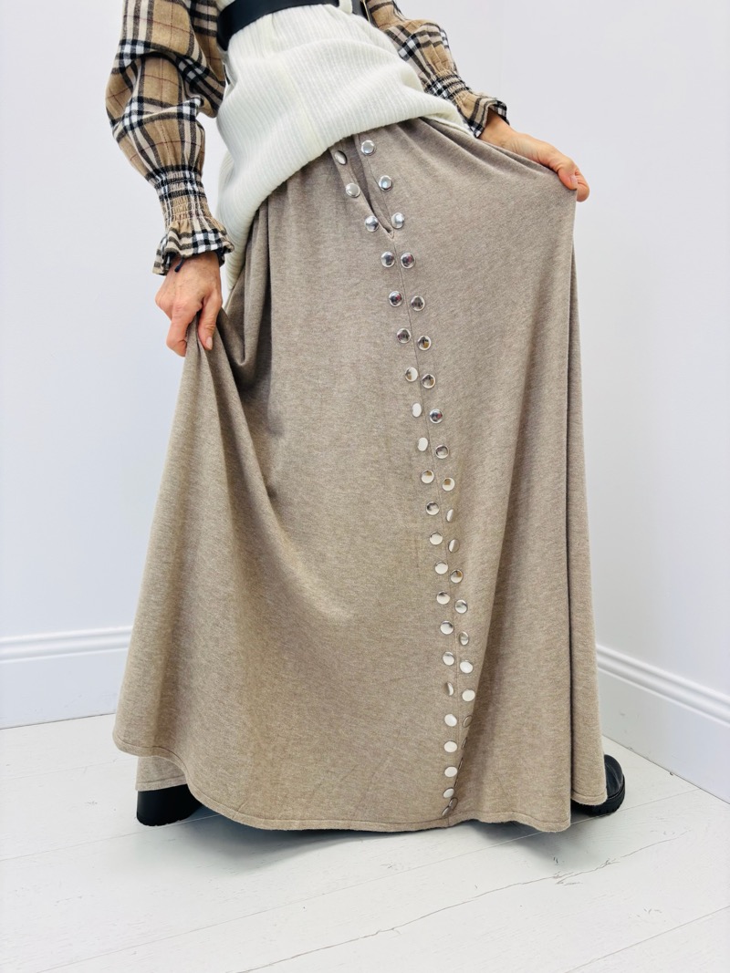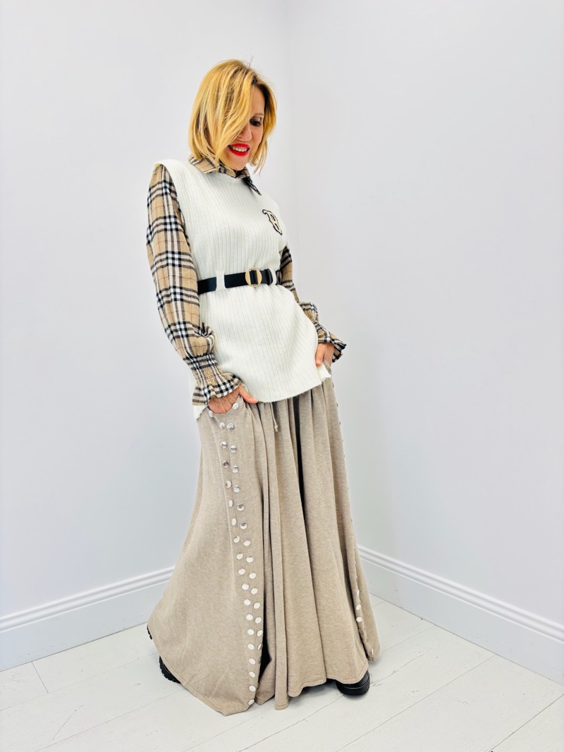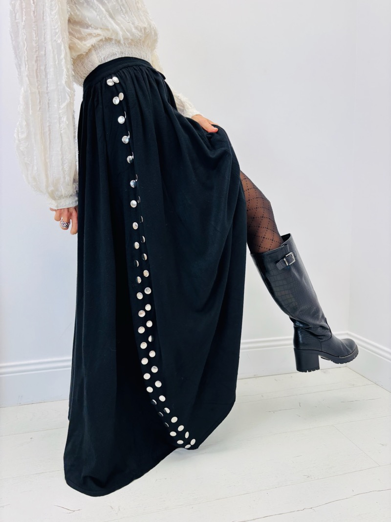 Une jupe longue fluide, confortable et ultra-stylée : la jupe CHAVIVA est la pièce parfaite pour apporter une touche bohème et moderne à n’importe quel look. Sa taille élastiquée s’adapte facilement et offre un maintien agréable. Le détail signature : la ligne de boutons métalliques sur le côté, qui donne du caractère et un mouvement élégant à chaque pas.