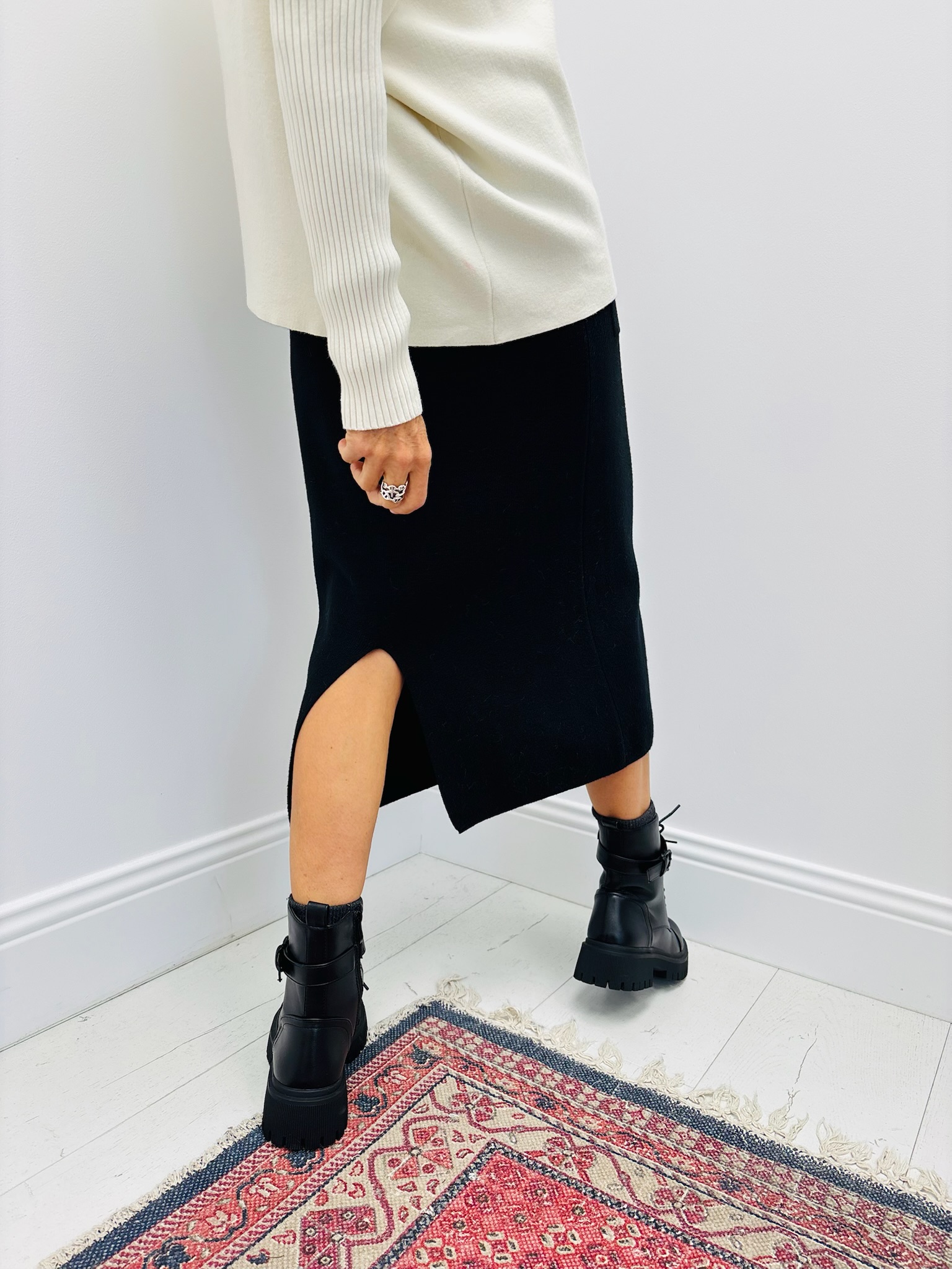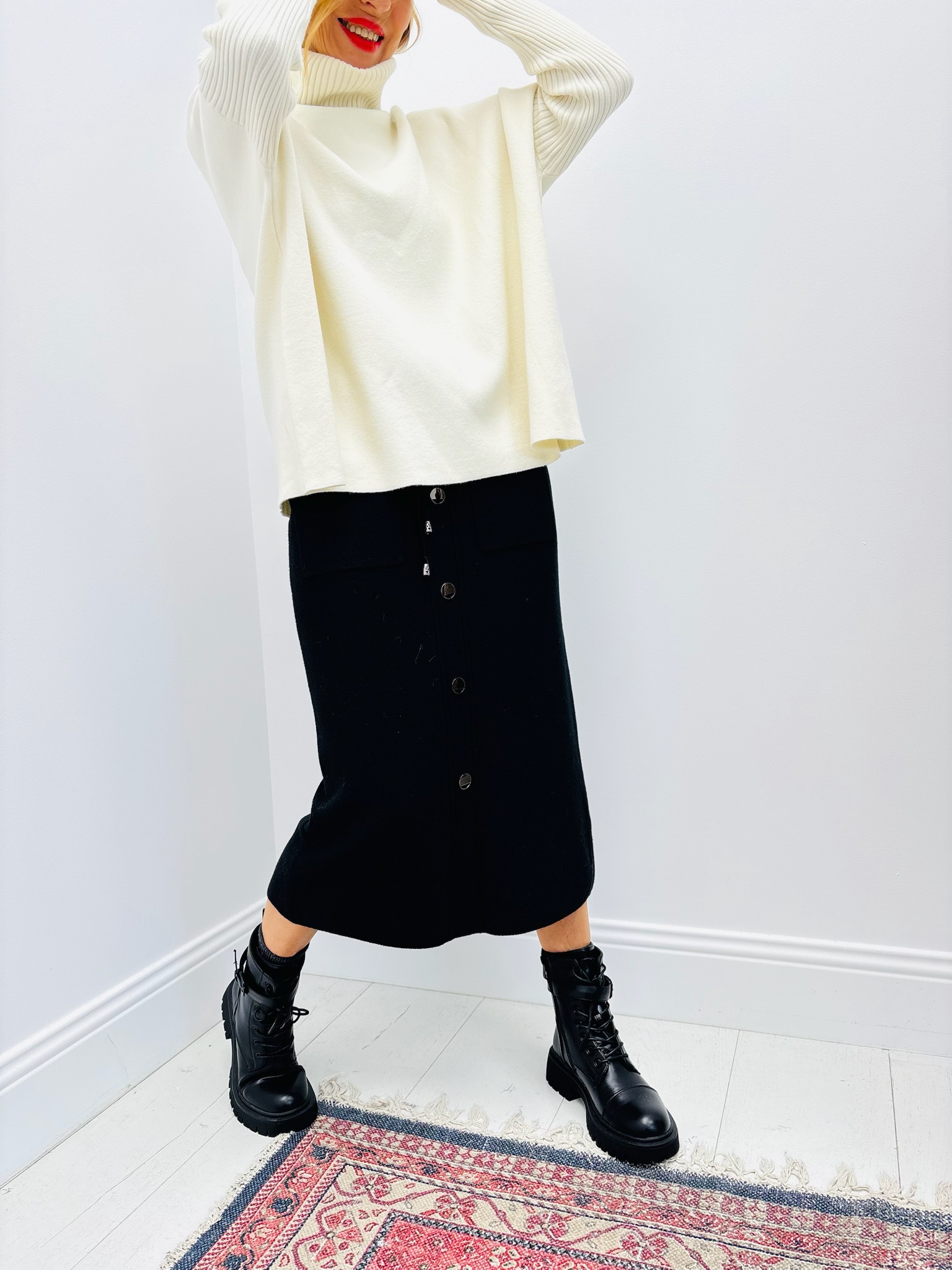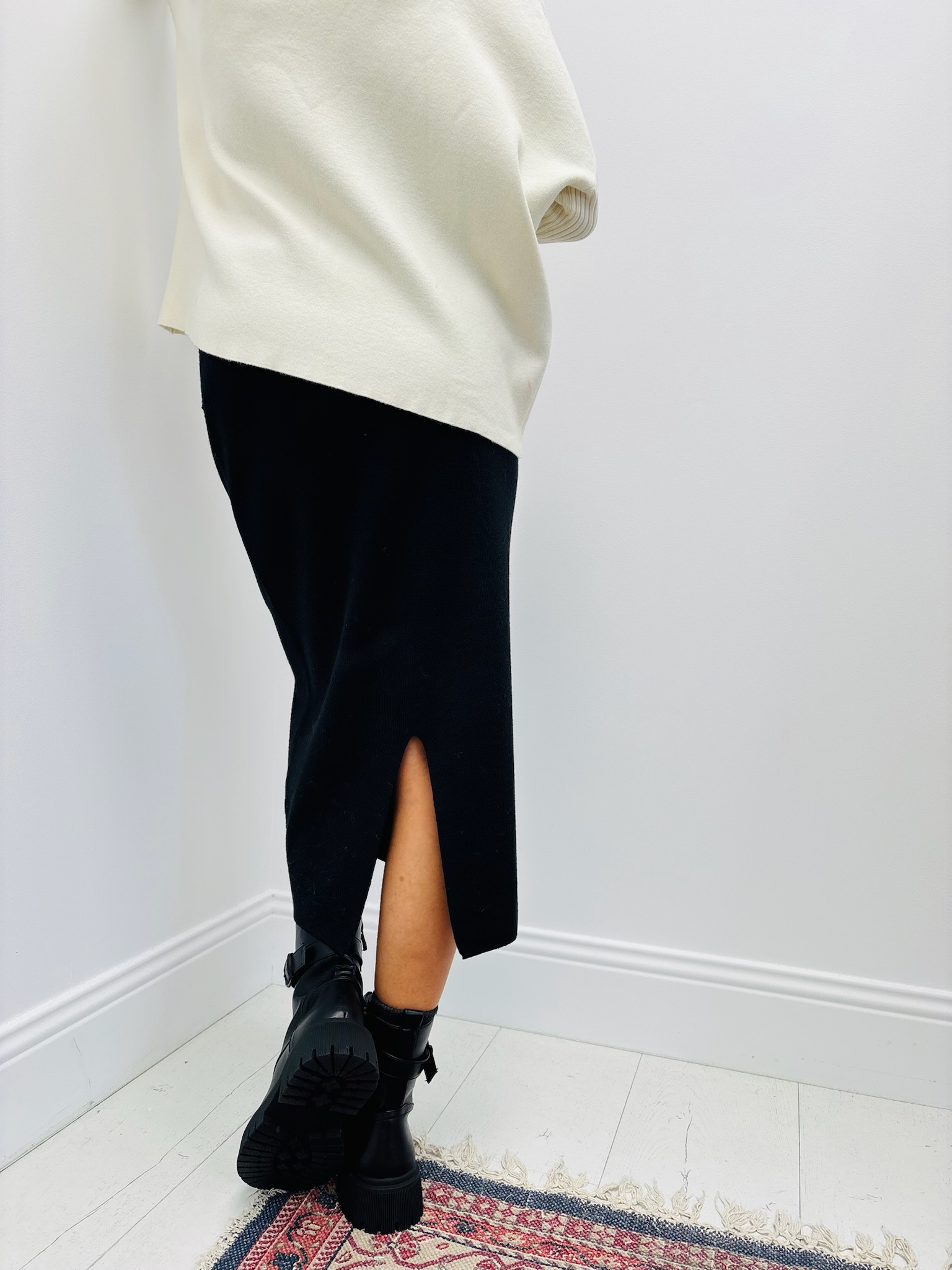 Cette jupe longue en maille signée VALENTYNE combine élégance et confort grâce à sa coupe droite et son tissu doux légèrement extensible.