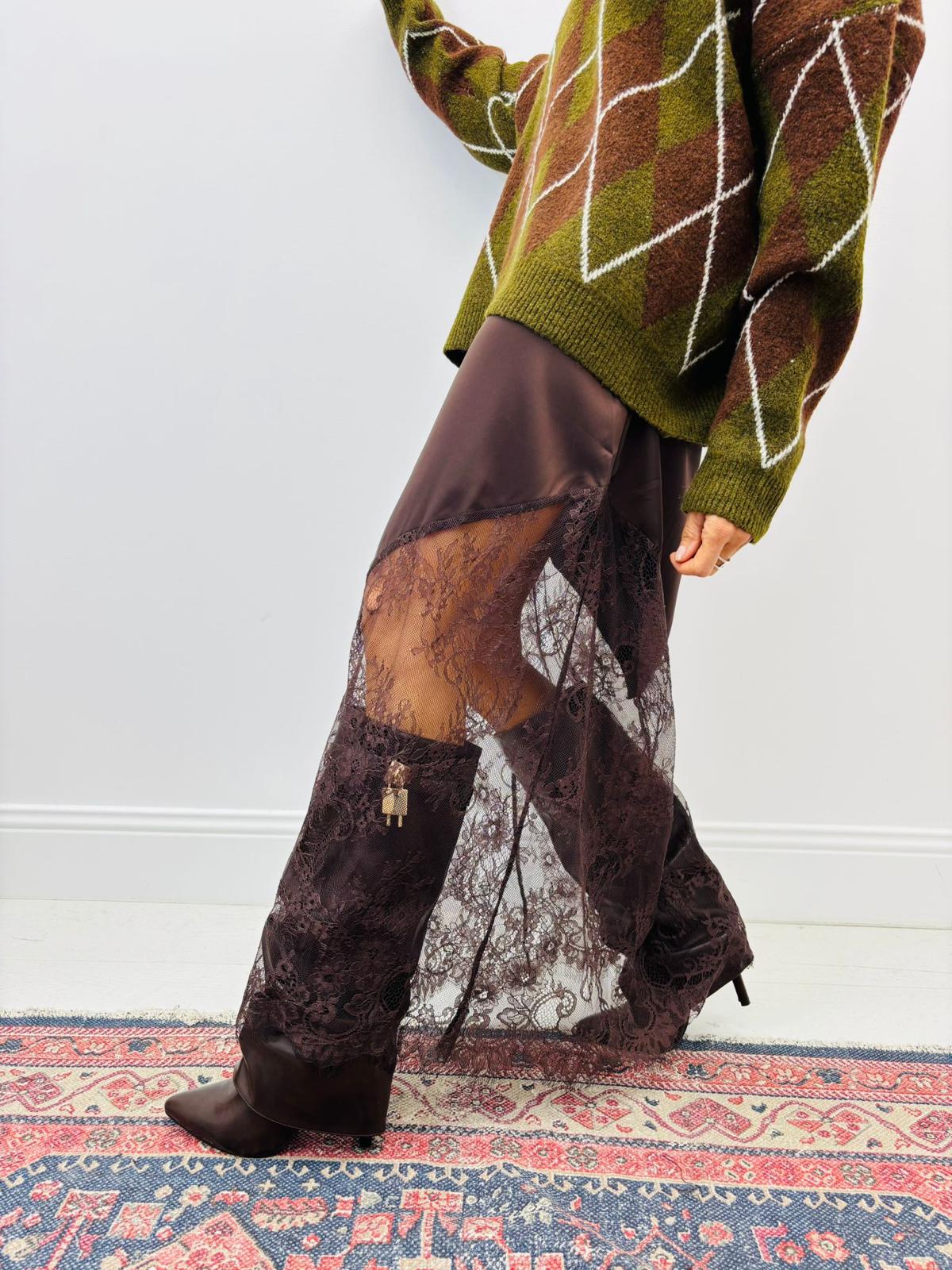 Cette jupe longue associe la douceur du tissu satiné à la délicatesse de la dentelle ajourée, pour un rendu à la fois chic et bohème.