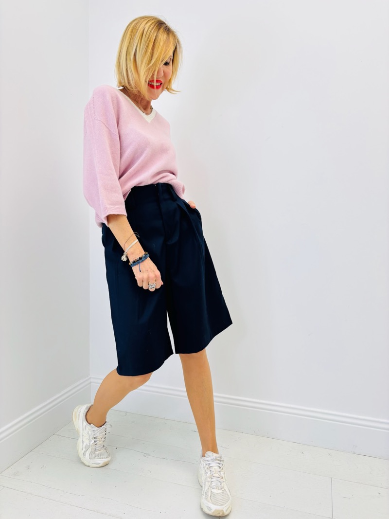Le col V bleu contrasté illumine la tenue et apporte un point d’éclat qui rend la silhouette dynamique.