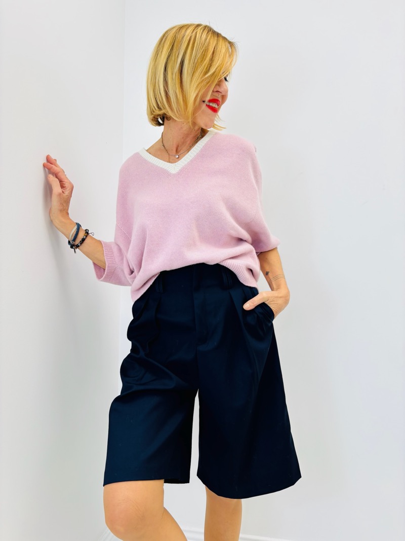 Le col V souligné d’un liseré contrasté apporte une touche lumineuse et féminine, tout en affinant joliment le haut du buste.