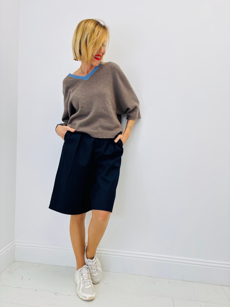 Sur les visuels, la maille marron est portée avec un bermuda noir large, créant un look casual chic très moderne.