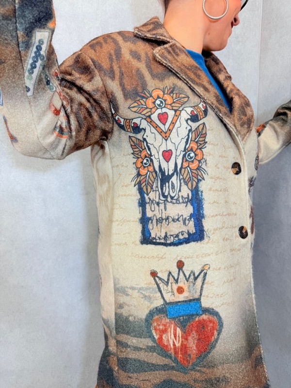Le + : un manteau artistique et chaleureux qui apporte une touche de fantaisie à vos tenues d’hiver.