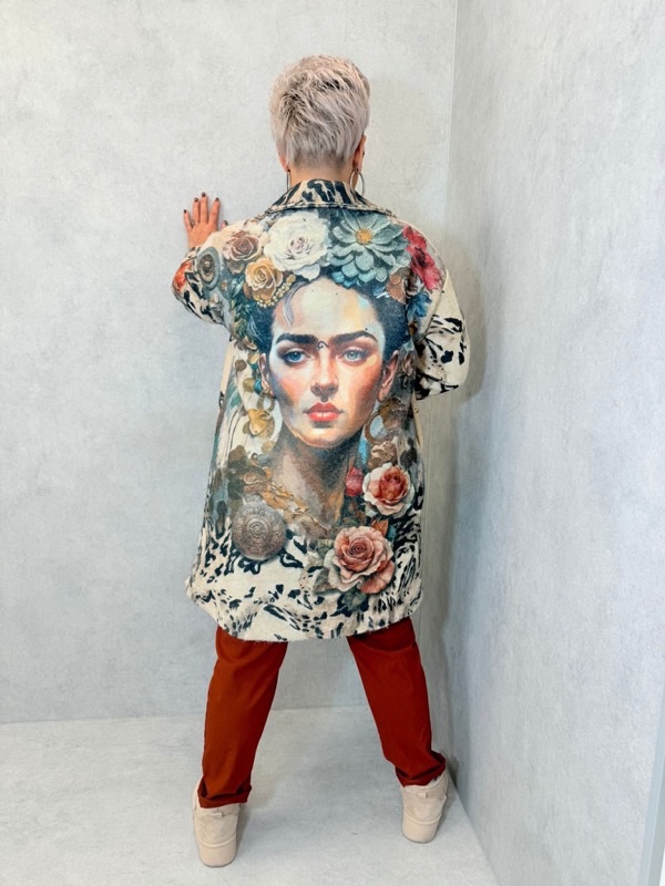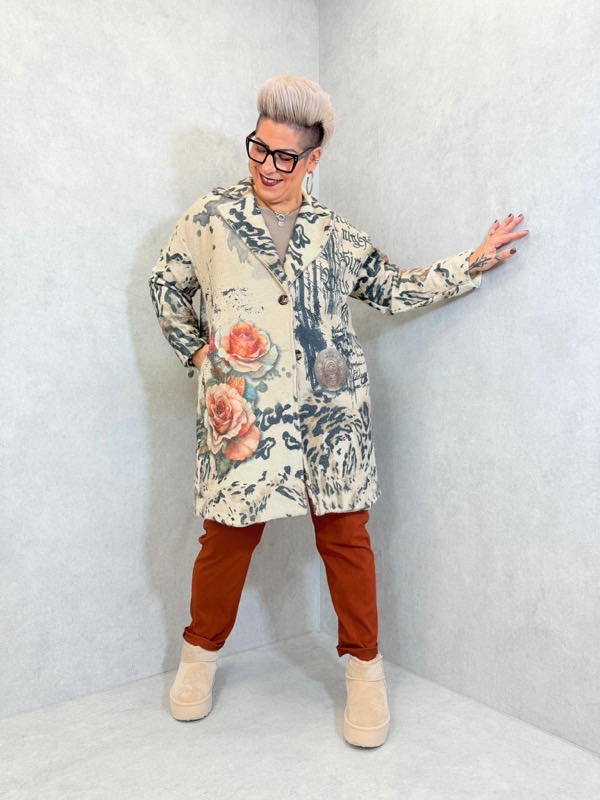 Un manteau original et féminin qui mêle élégance et confort. Sa matière effet laine bouillie offre une belle chaleur, tandis que son imprimé artistique mêlant motifs abstraits et fleurs apporte une touche romantique et contemporaine. Sa coupe droite et ample convient parfaitement aux silhouettes du 44 au 52.