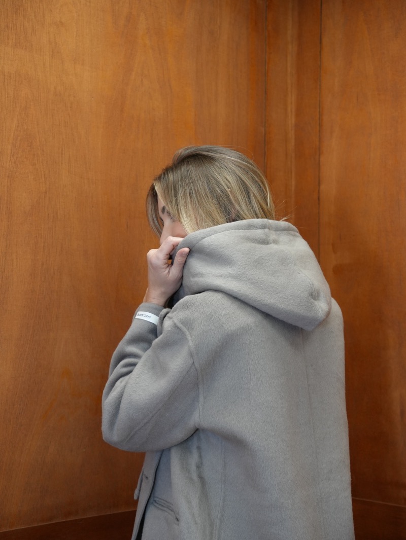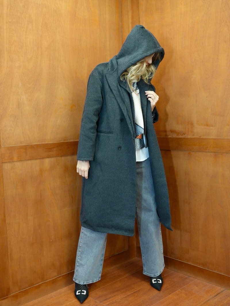 La capuche portée sur la tête ajoute un style street chic très actuel, parfait pour les jours de froid. Elle renouvelle le style du manteau classique en le rendant plus contemporain.