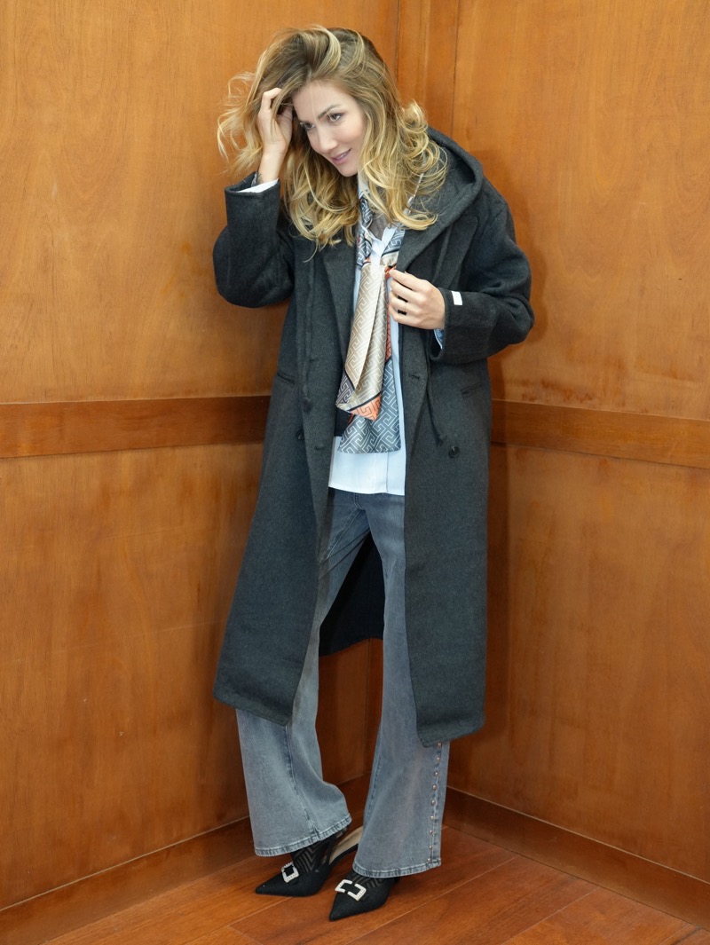 Associé à une chemise blanche et un jean large gris, il crée une silhouette épurée, élégante et moderne. Le manteau adoucit le look tout en structurant la tenue grâce à sa coupe impeccable.