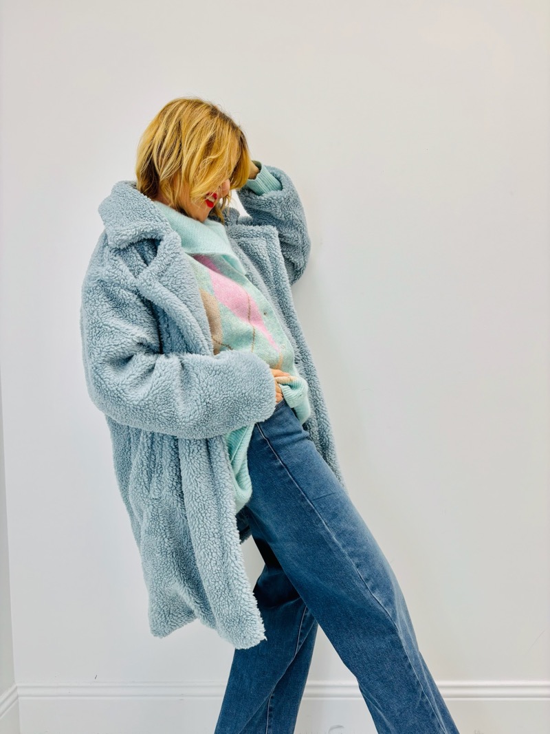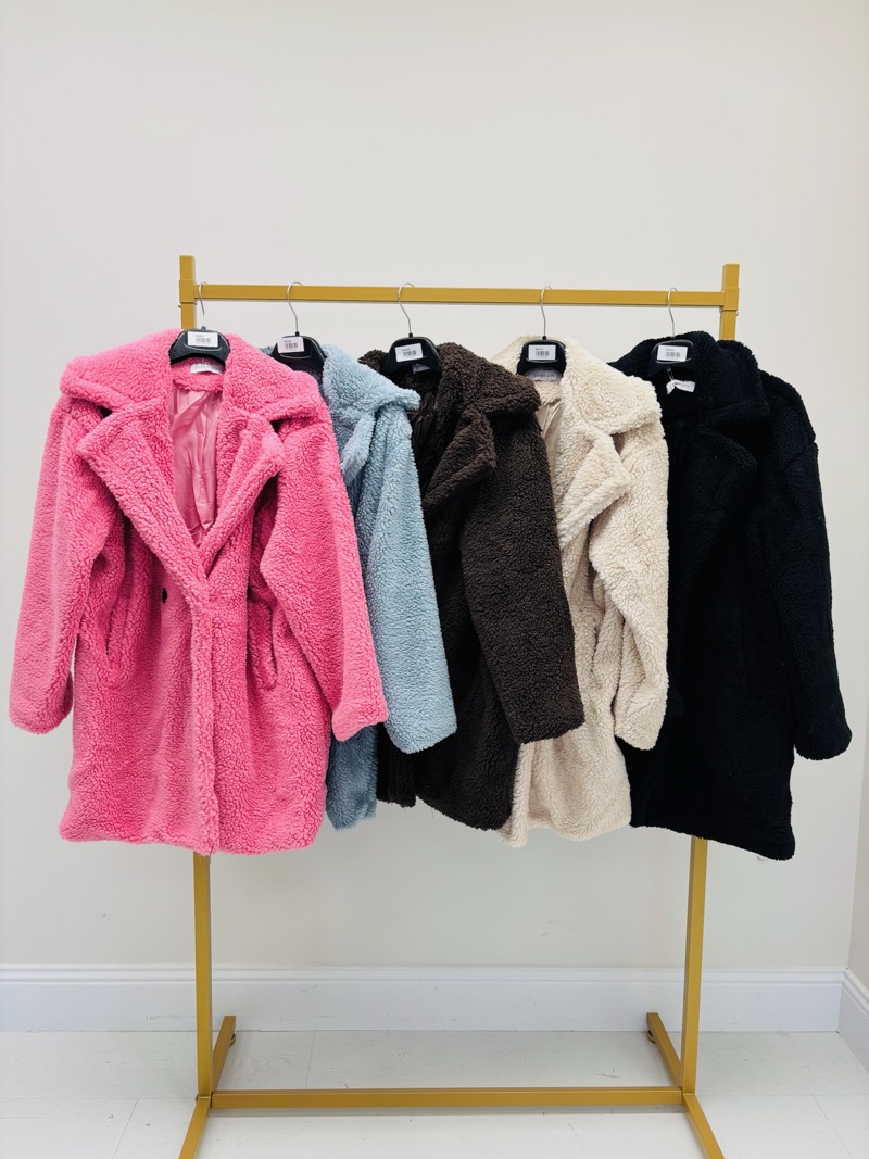 Disponible en plusieurs coloris — rose vif, bleu ciel, chocolat, beige, noir, ce manteau s’adapte à toutes les envies mode, du look audacieux au style plus neutre. Son grand col amplifie l’effet cocooning, tandis que la fermeture boutonnée permet de le porter ouvert ou fermé selon votre silhouette et votre mood du jour.