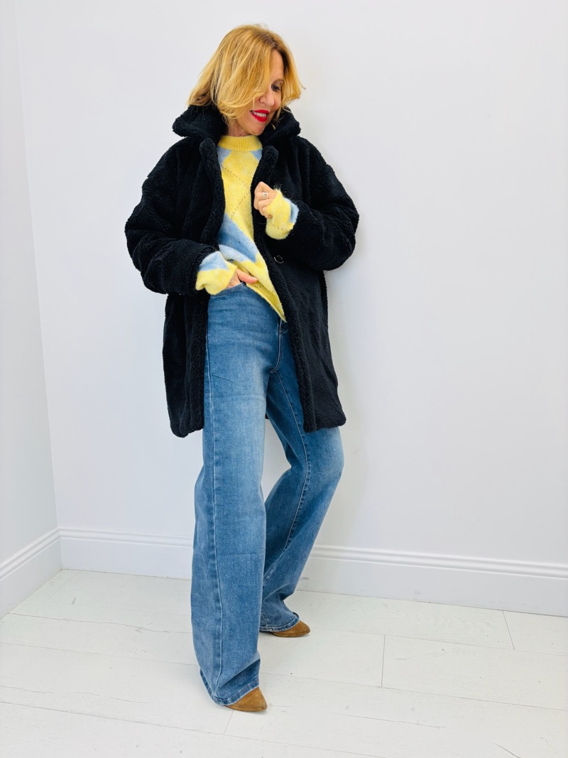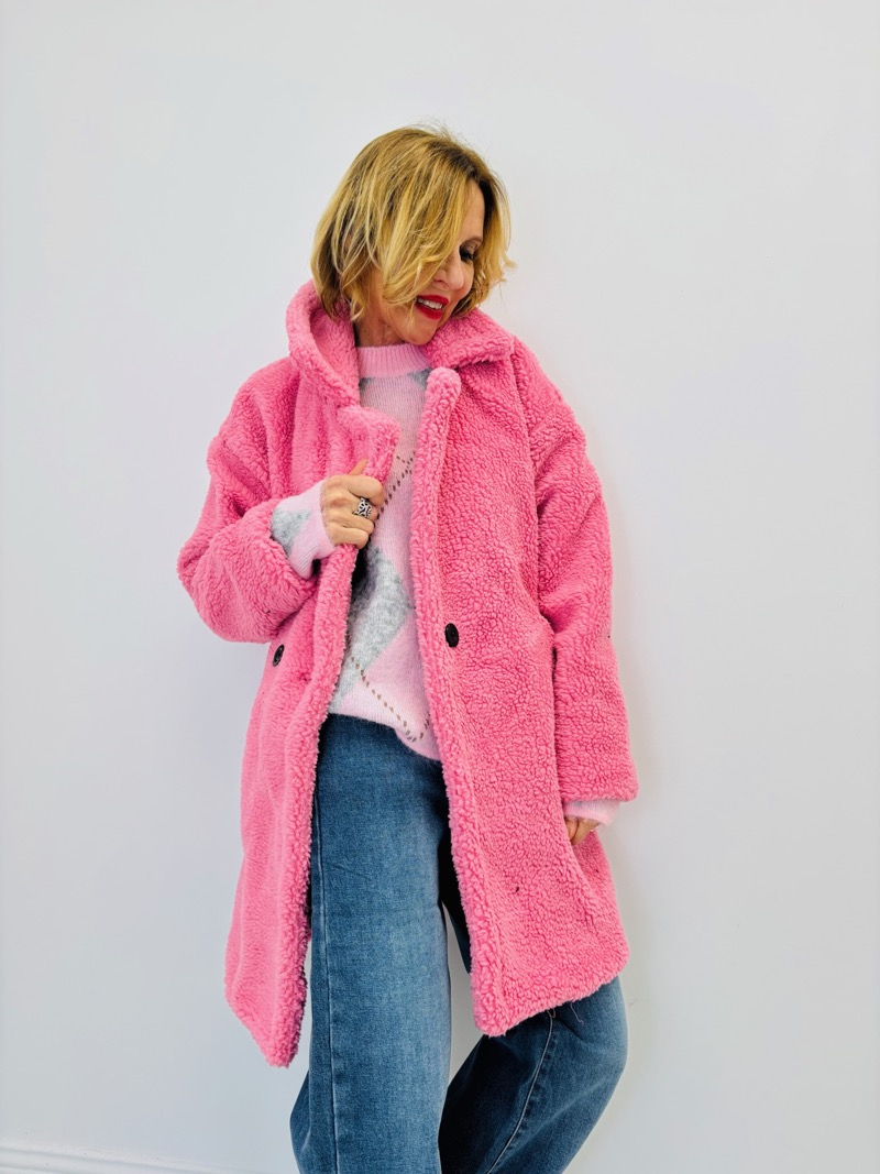 Sur les visuels, le modèle est porté en version rose vif, une couleur pétillante qui illumine instantanément le look. Associé à un pull doux multicolore aux teintes pastel et à un jean flare, le manteau crée un style chaleureux, moderne et casual-chic. Cette combinaison apporte à la fois confort et dynamisme, idéale pour la saison froide.