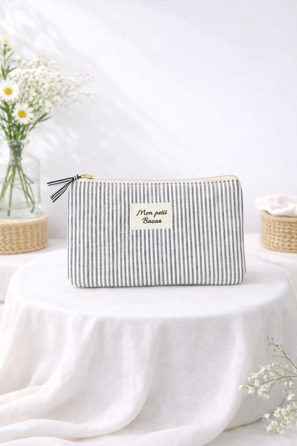 Douce, fraîche et intemporelle, cette mini pochette rayée Mon petit Bazar séduit par son esthétique épurée et son esprit délicatement rétro. Son motif à fines rayures, décliné dans des coloris lumineux et faciles à assortir, en fait un accessoire incontournable pour une clientèle à la recherche de simplicité chic et de fonctionnalité.