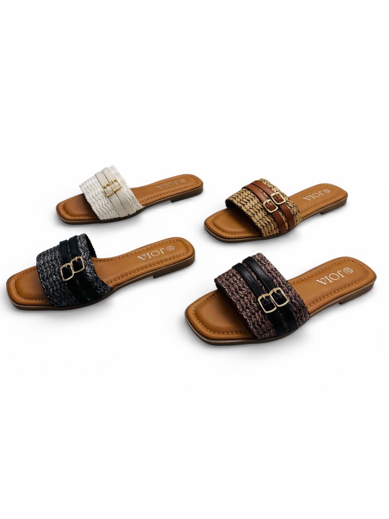 Sa large bride tressée apporte immédiatement un esprit naturel et estival. Le détail de la double boucle dorée décorative ajoute une touche chic qui modernise le modèle et le rend plus premium visuellement.
