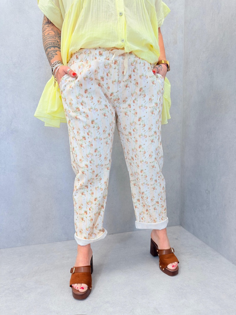 Ajoutez une touche florale à votre garde-robe avec ce pantalon en coton au design élégant et confortable. Idéal pour une journée décontractée.