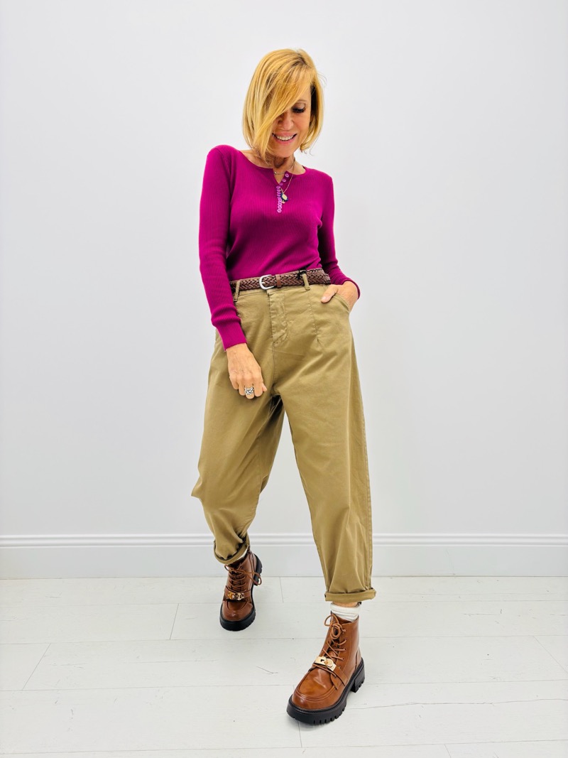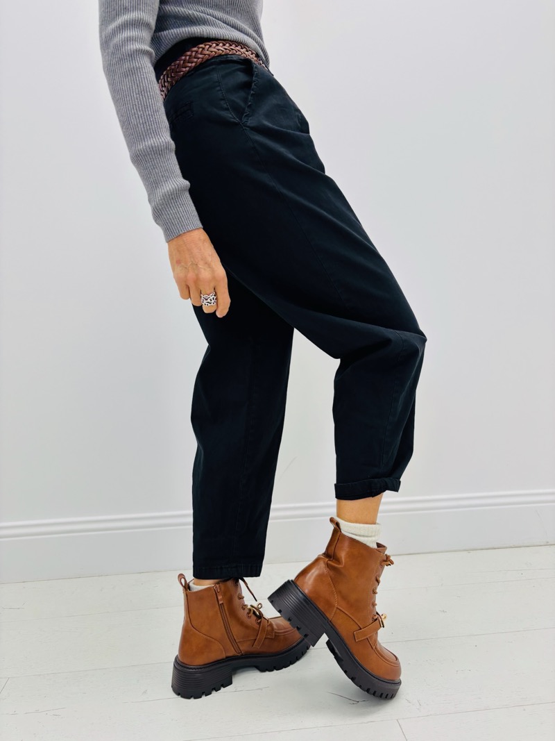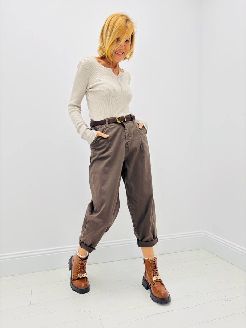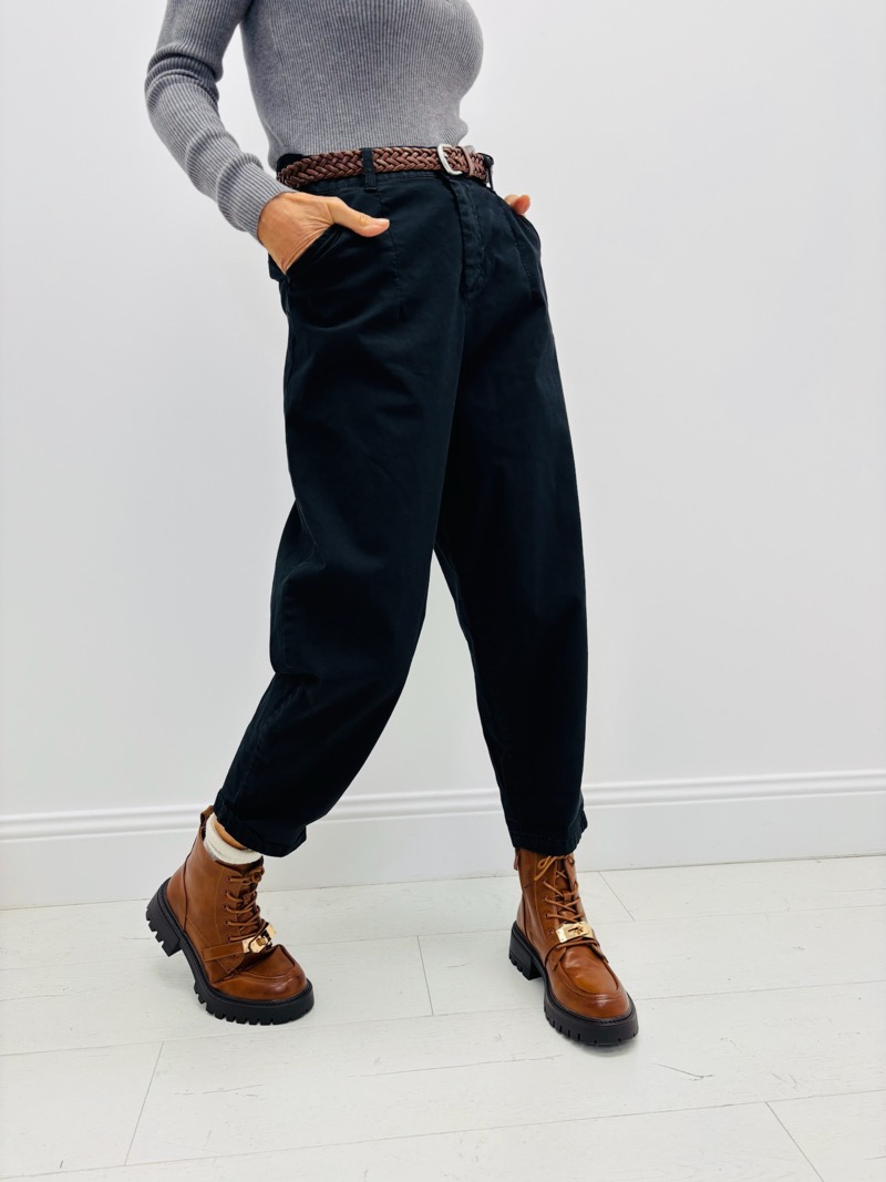 Un pantalon casual et élégant, parfait pour vos looks du quotidien. Sa coupe carotte légèrement ample et sa taille haute ceinturée apportent confort et modernité.