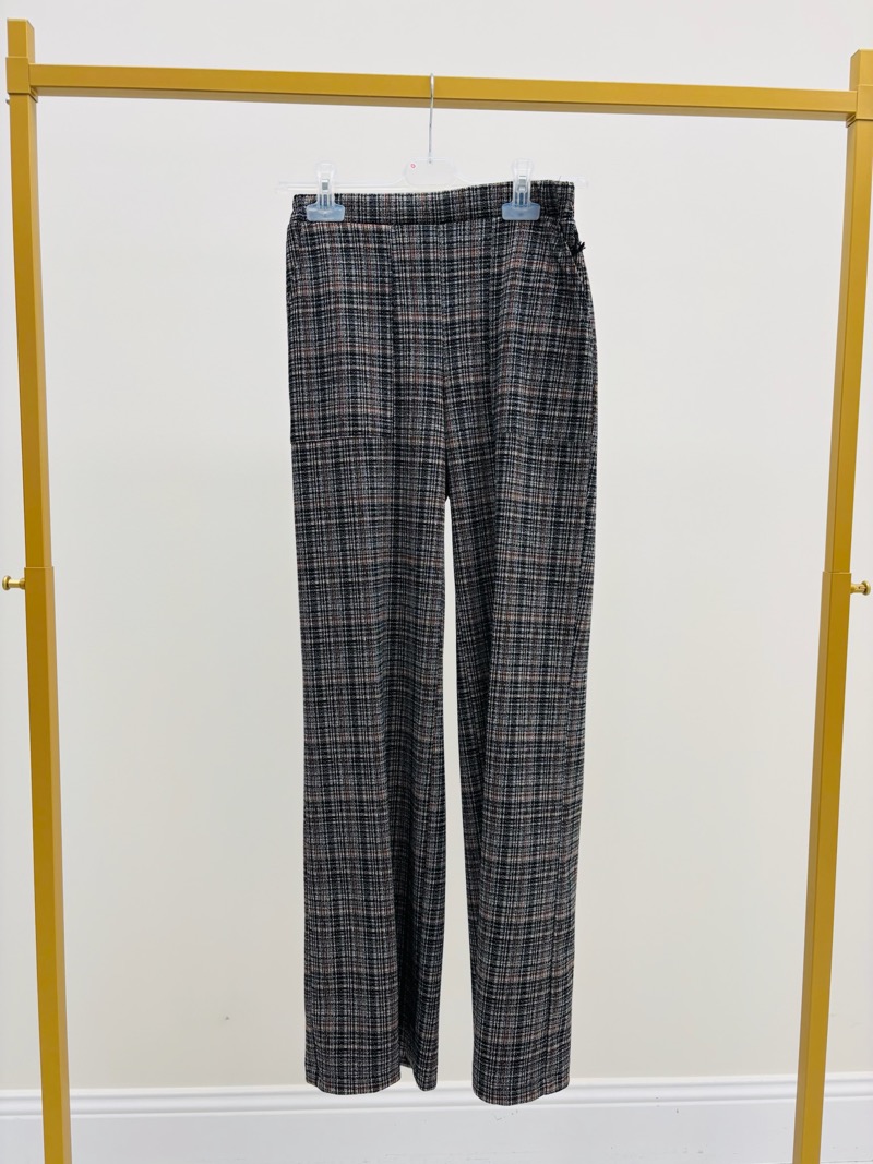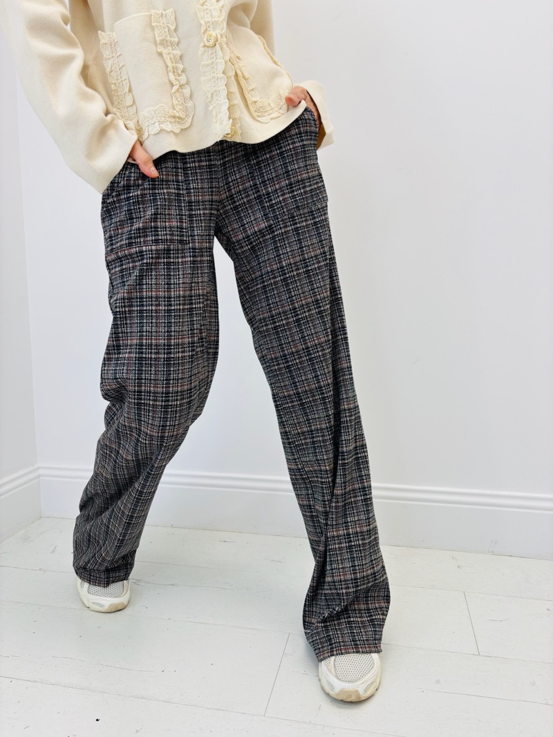 La fluidité du pantalon apporte du mouvement à la silhouette, tandis que le motif carreaux structure l’ensemble.