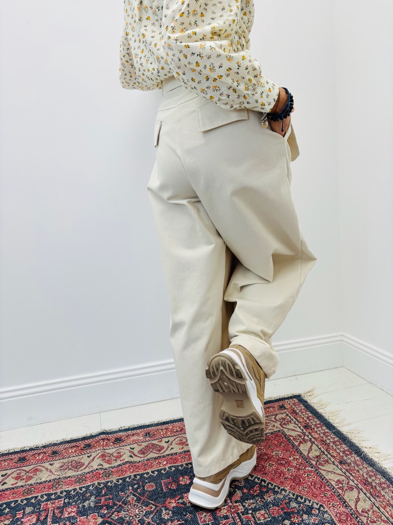 Confectionné dans une matière souple et agréable, ce modèle se distingue par son jeu de pinces qui accentue le volume et donne du caractère à la coupe. La ceinture assortie avec boucle permet d’ajuster la taille et d’apporter une finition élégante, renforçant l’aspect chic et structuré du pantalon.