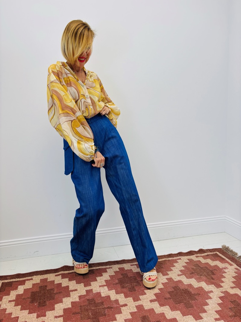 Associé à une blouse fluide ou une chemise imprimée, il crée une silhouette chic et moderne. En version coordonnée avec le gilet en jean, il forme un total look sophistiqué et tendance.