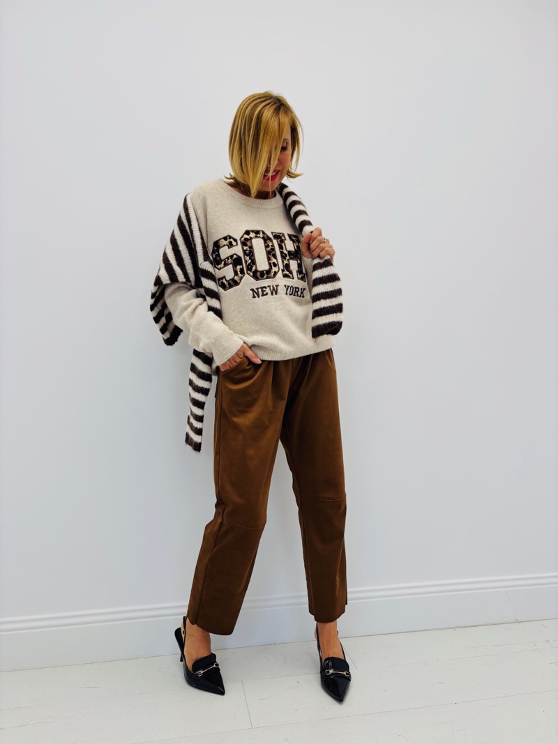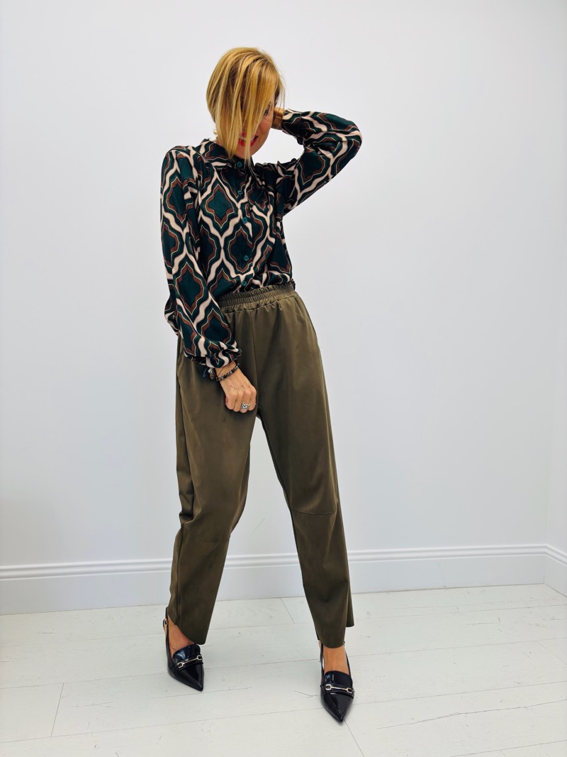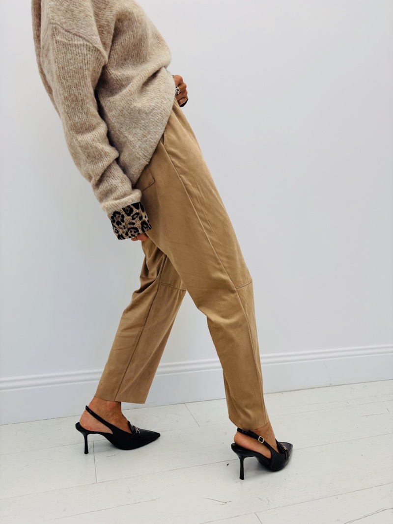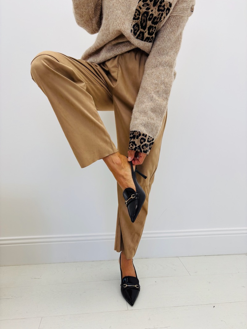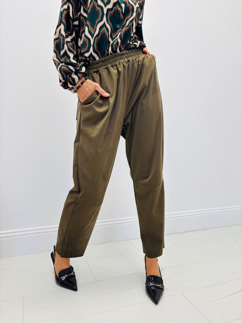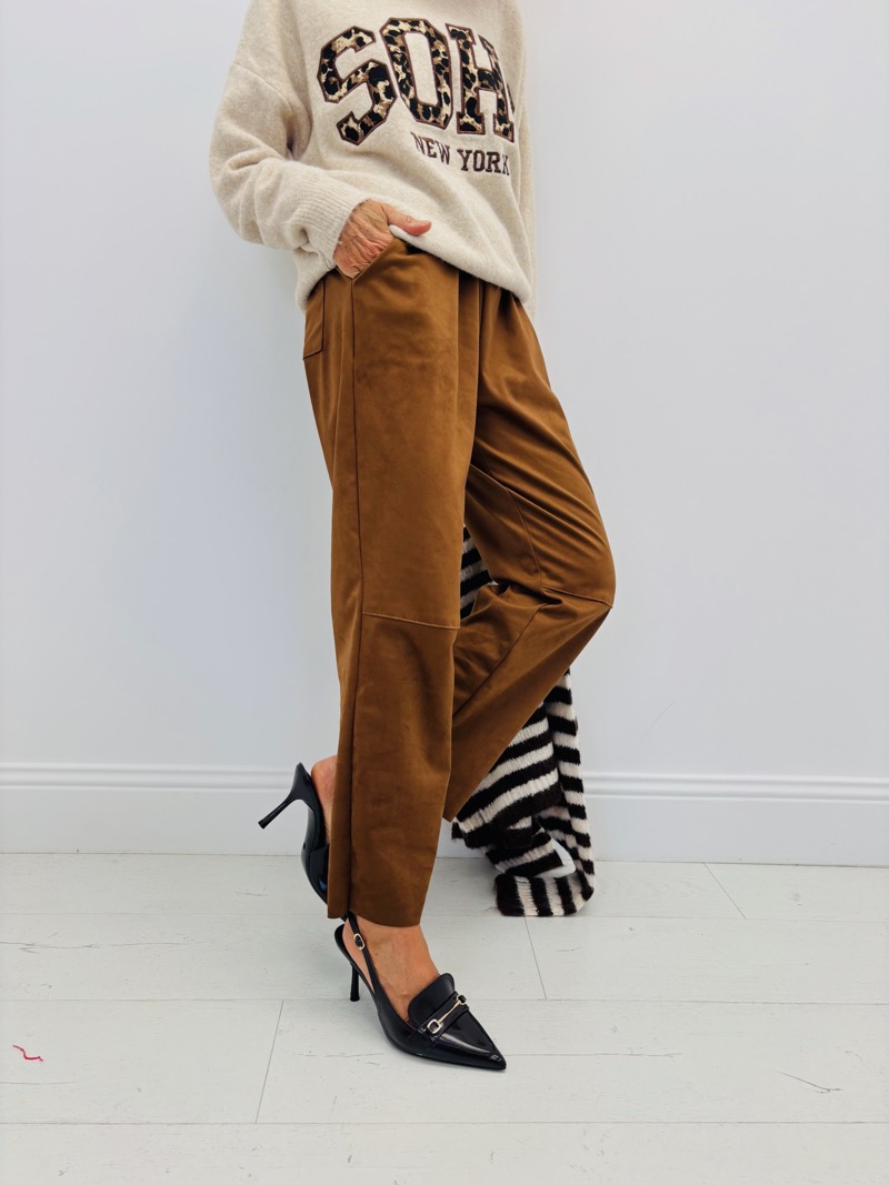 Un pantalon chic et confortable, confectionné dans une suédine douce et fluide. Sa coupe droite légèrement ample et sa taille élastiquée en font une pièce à la fois élégante et agréable à porter au quotidien.
