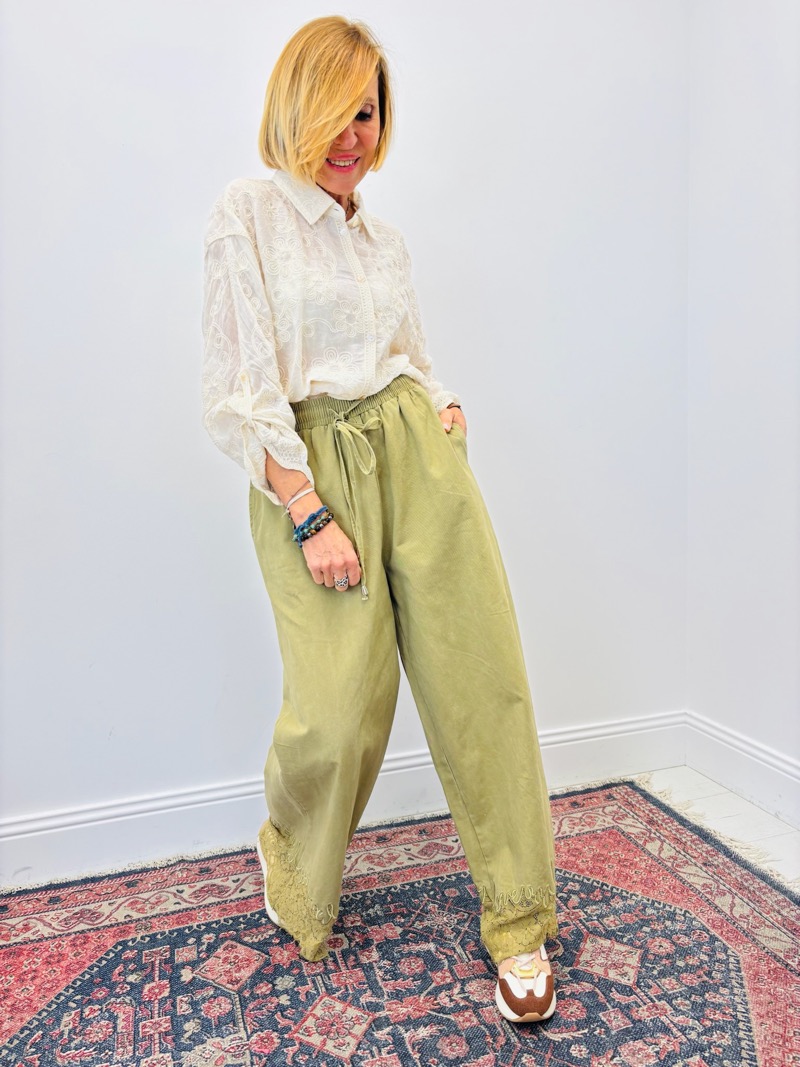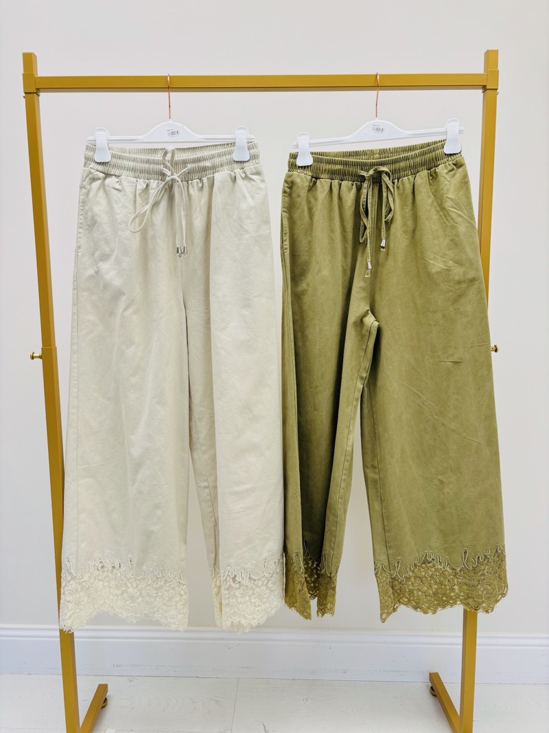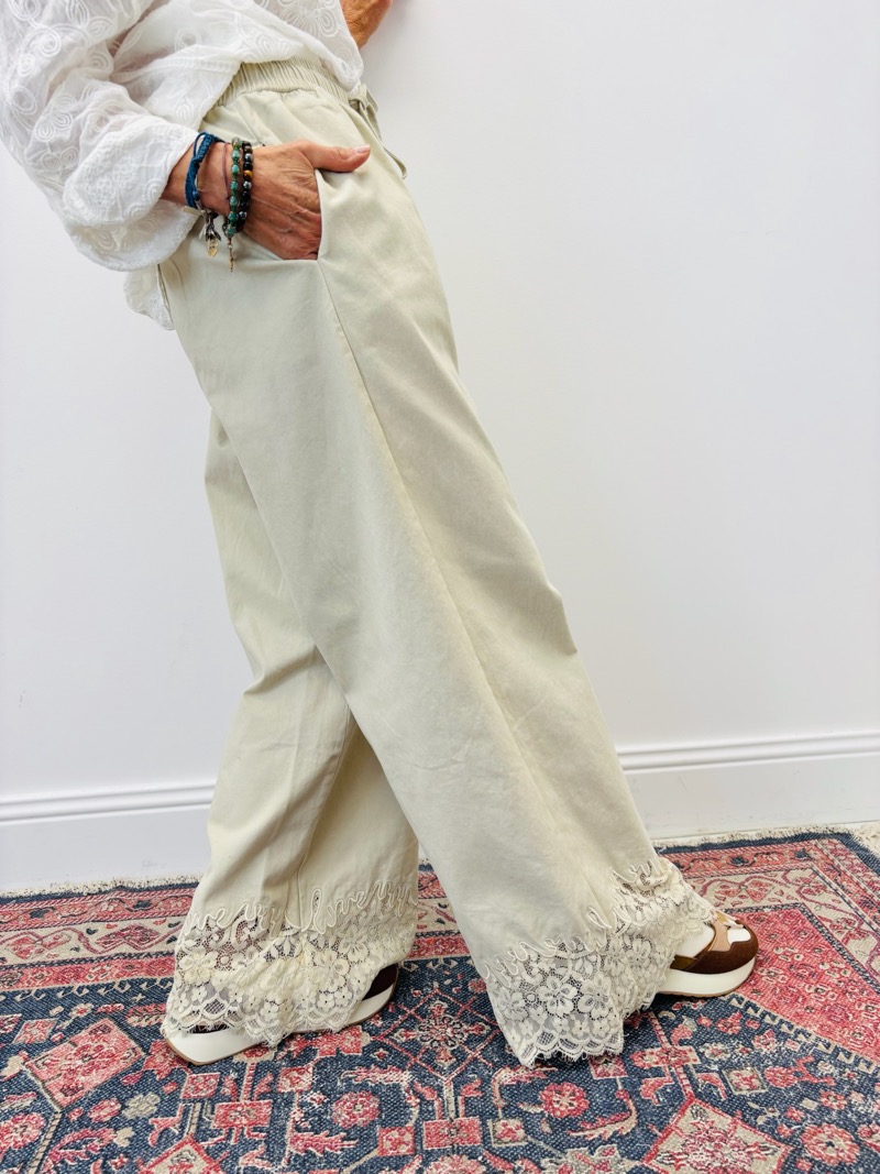 Le détail dentelle en bas de jambe apporte une note romantique subtile, parfaite pour casser le côté utilitaire de la toile de jean. Ce pantalon se porte aussi bien avec une blouse légère, un top en dentelle ou une veste assortie pour un total look élégant et harmonieux.