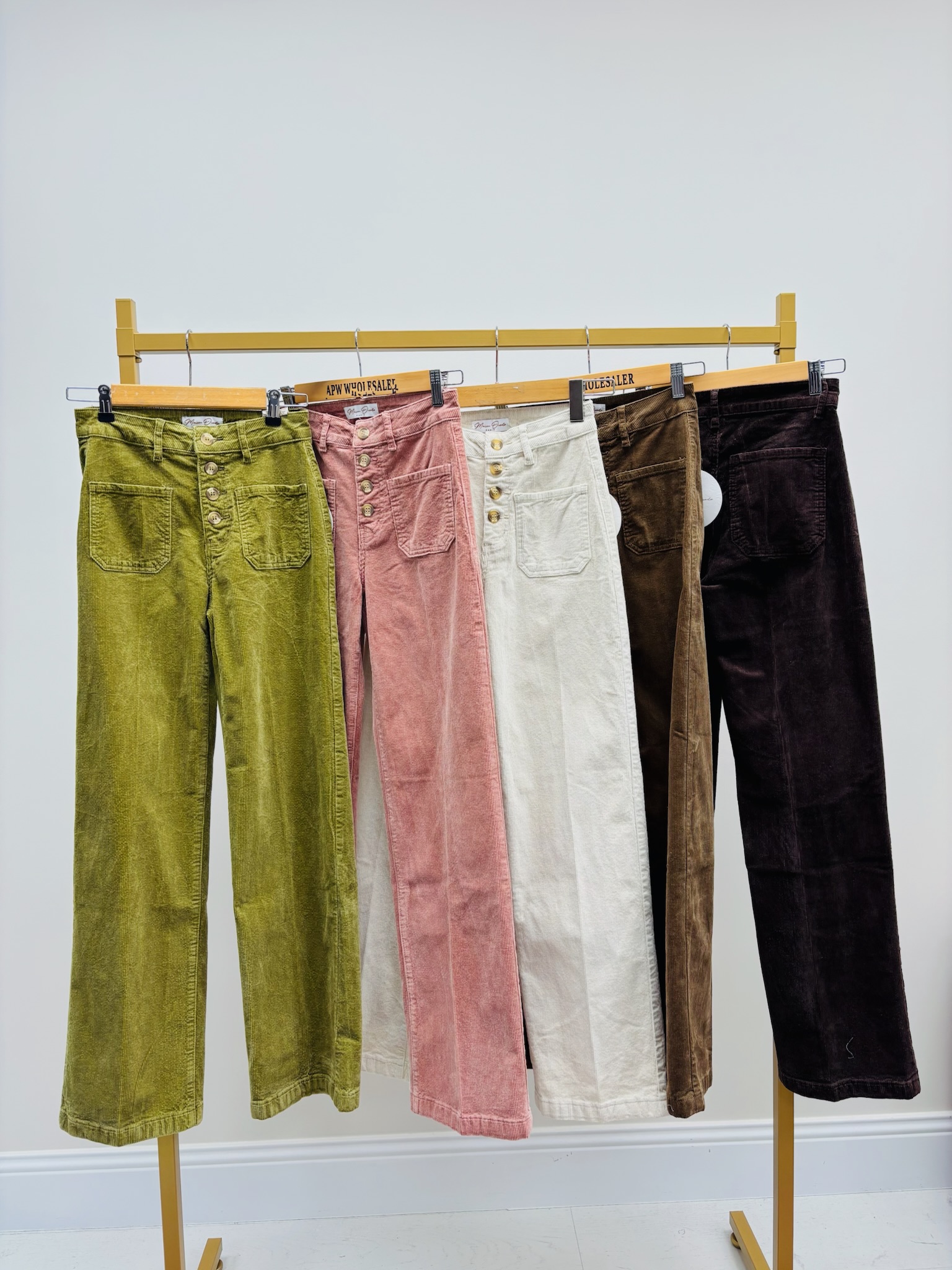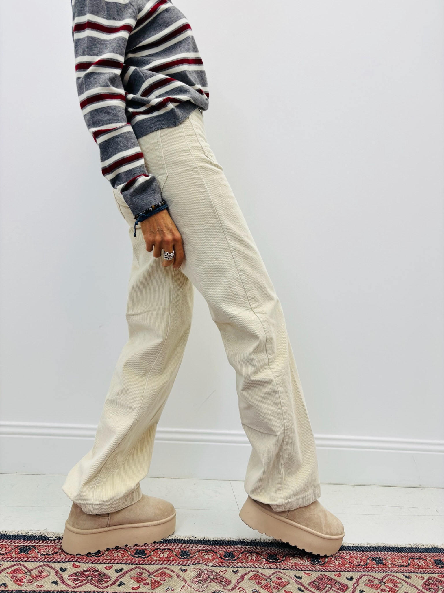 Confectionné dans un velours côtelé souple, ce modèle séduit par sa coupe droite et sa taille haute qui allongent la silhouette.