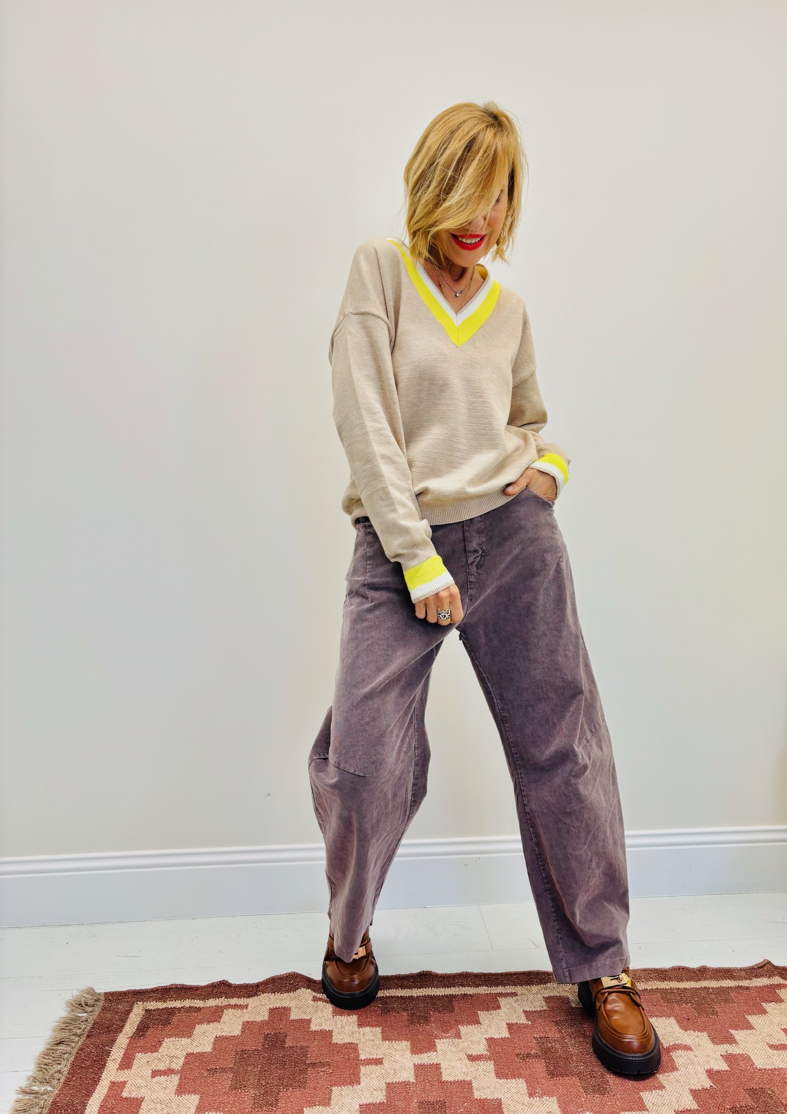 Ce pantalon en velours combine souplesse et style avec sa coupe barrel (jambe arrondie et resserrée à la cheville).