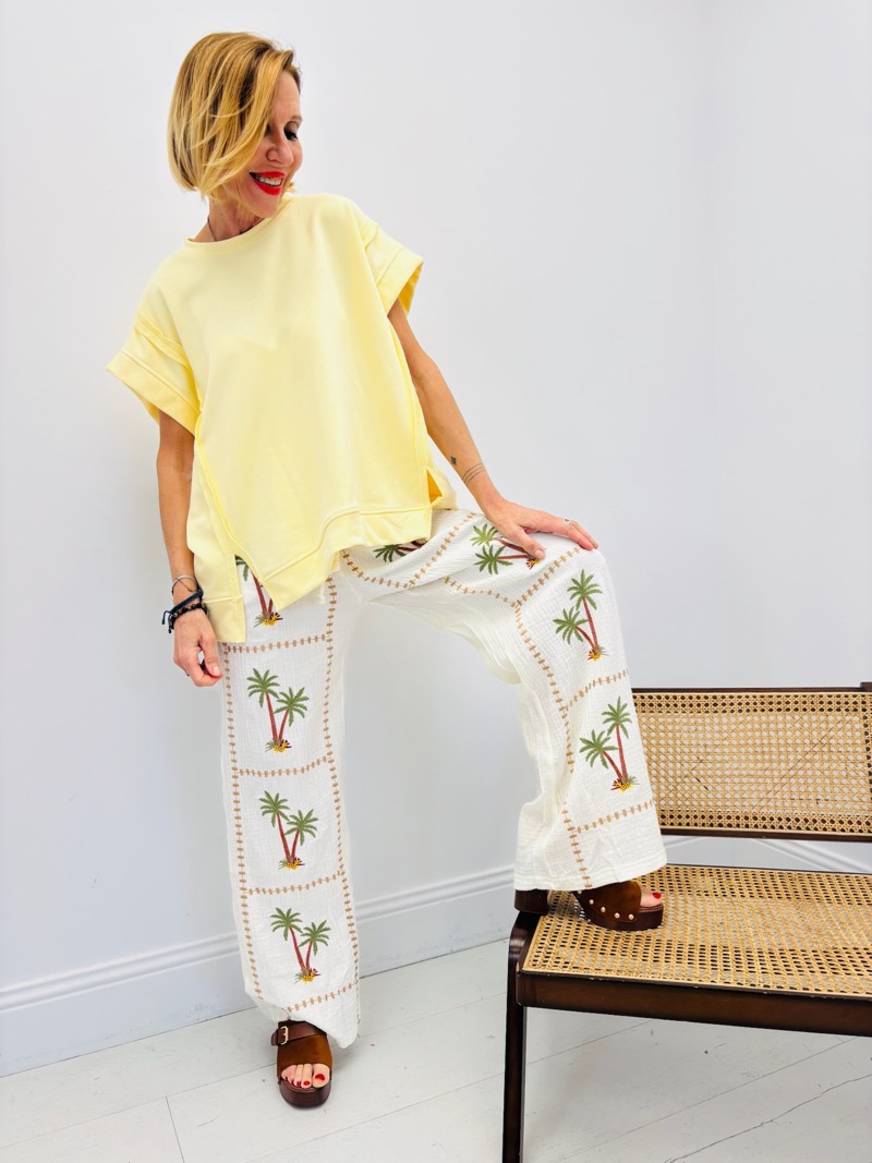 Pantalon en gaze de coton légère au style bohème chic, parfait pour une silhouette estivale élégante et décontractée. Sa matière 100% coton offre un tombé fluide et respirant, idéal pour les saisons chaudes. On retrouve un travail de broderie délicat représentant des palmiers, apportant une touche ensoleillée et dépaysante à la pièce.