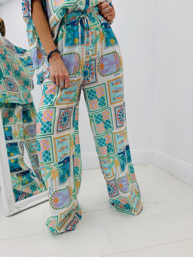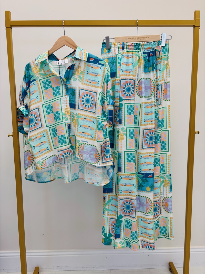 Ce pantalon fluide séduit par son imprimé graphique inspiré de l’univers bord de mer, mêlant motifs géométriques, palmiers et touches estivales dans des tons turquoise, bleu, vert et beige. Son visuel original lui donne une vraie personnalité, idéale pour dynamiser une sélection boutique avec une pièce forte et lumineuse.
