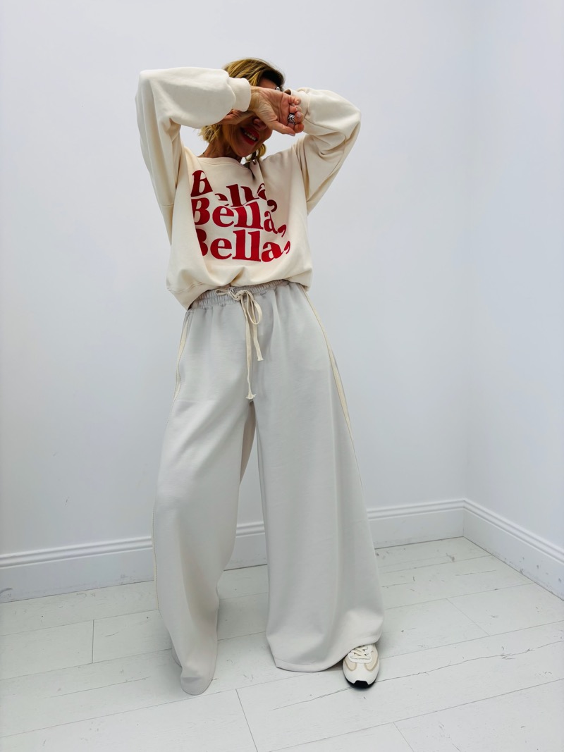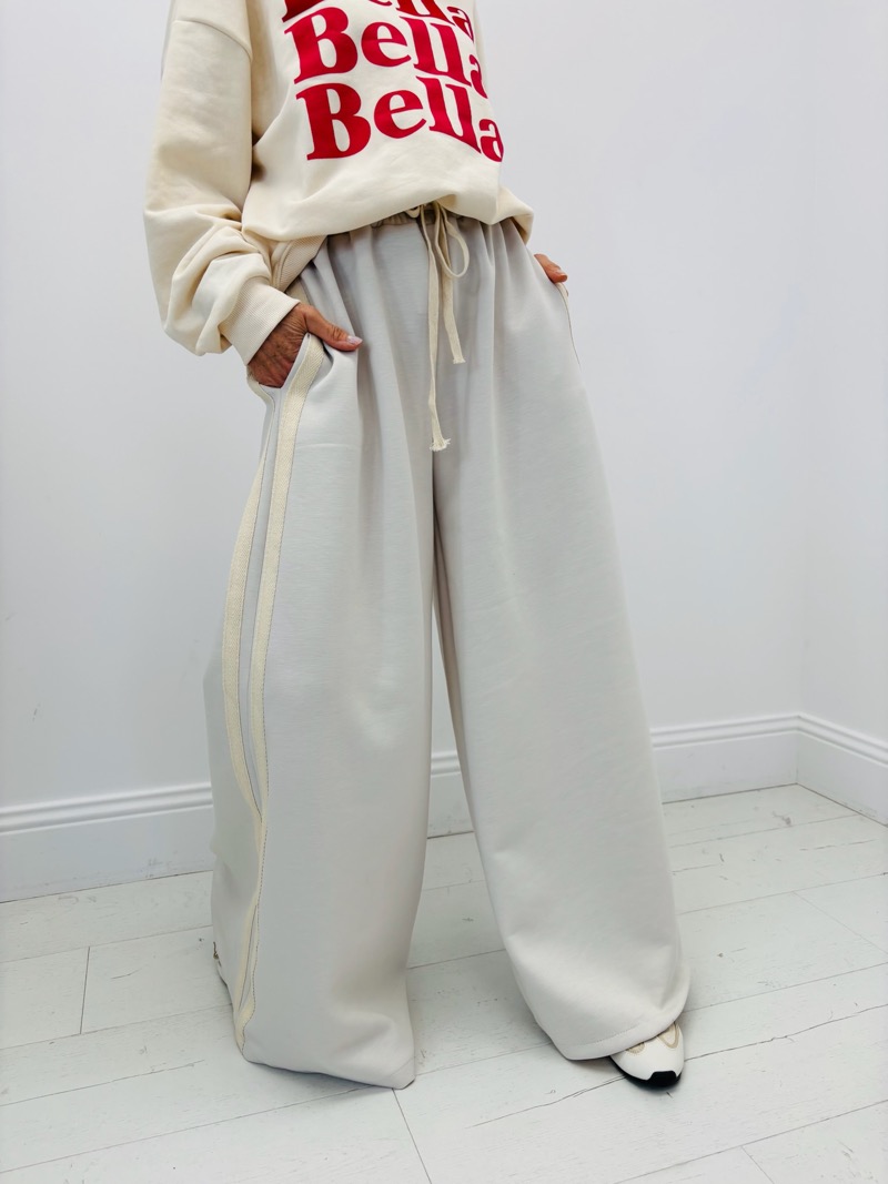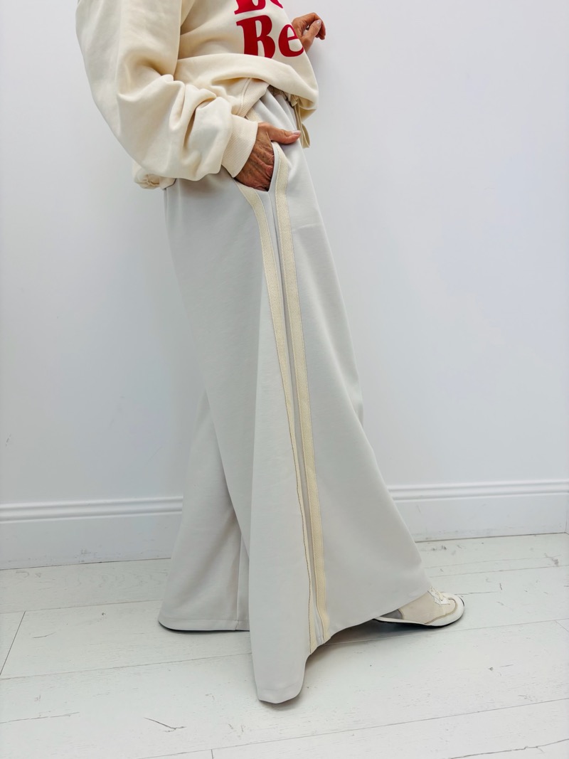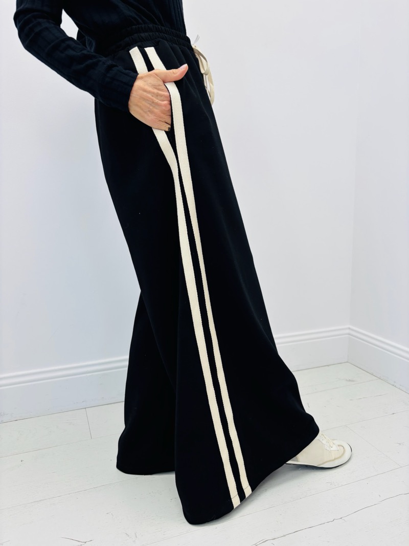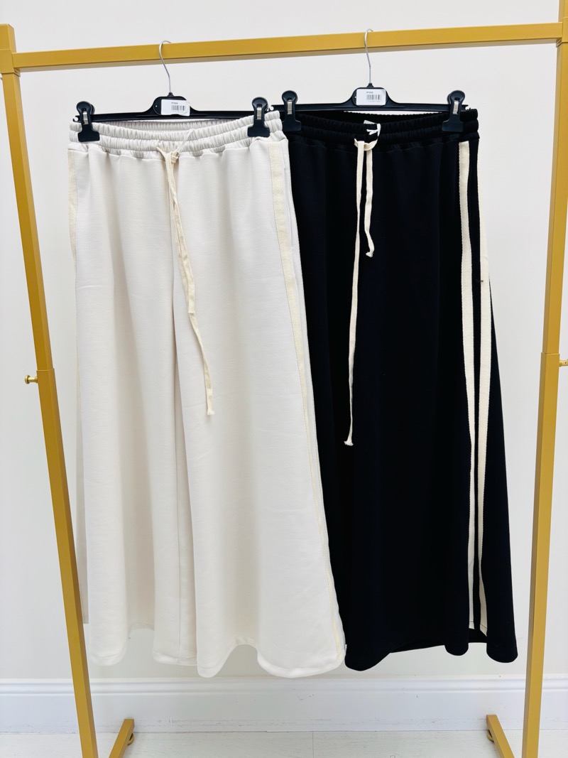 Sa taille élastiquée avec cordon de serrage garantit un ajustement parfait et un confort optimal au quotidien. Les bandes contrastées sur les côtés apportent une touche graphique qui rappelle l’univers sport chic, tout en allongeant visuellement la silhouette.