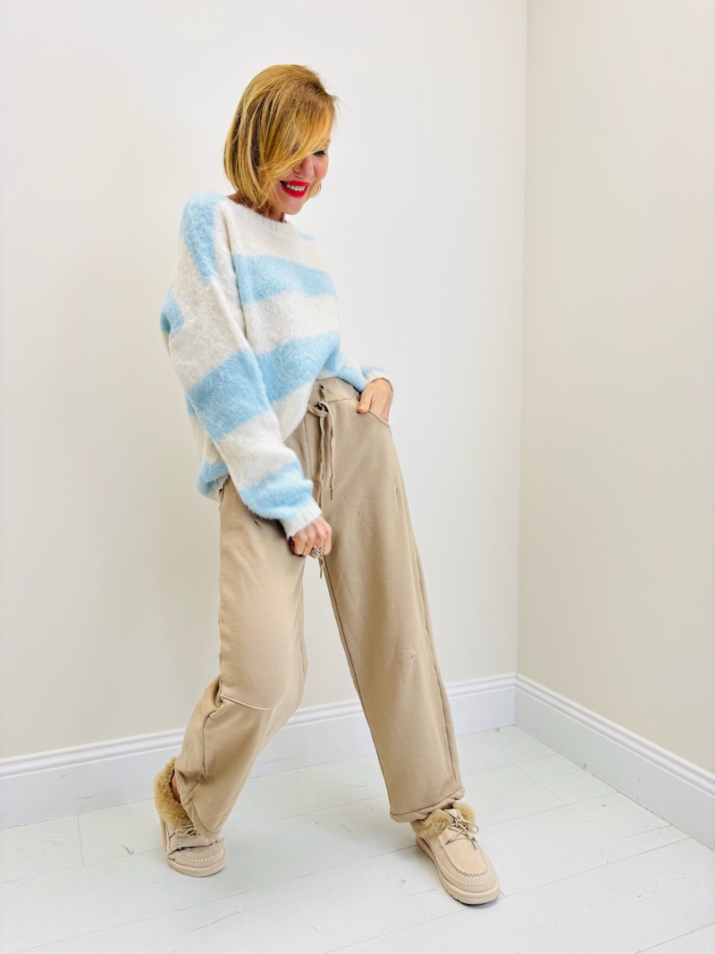 Ce pantalon se porte facilement avec un pull oversize, un sweat ou une maille douce pour un look casual chic et tendance. Il fonctionne aussi très bien avec une chemise ou un top plus structuré pour un contraste moderne. À associer avec des baskets ou des chaussures confortables pour une silhouette actuelle, décontractée et stylée.
