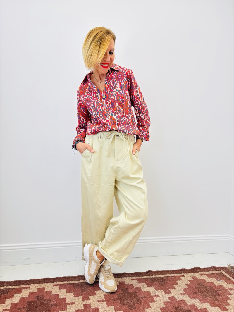 Associé à une chemise imprimée ou un top fluide, il crée un look casual chic parfaitement équilibré. Porté avec des sneakers beiges, il adopte une allure urbaine et moderne.