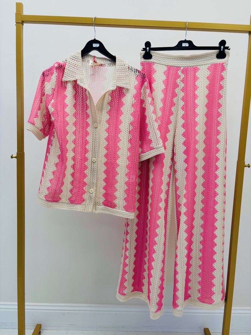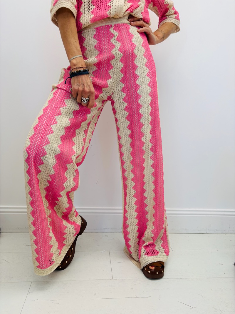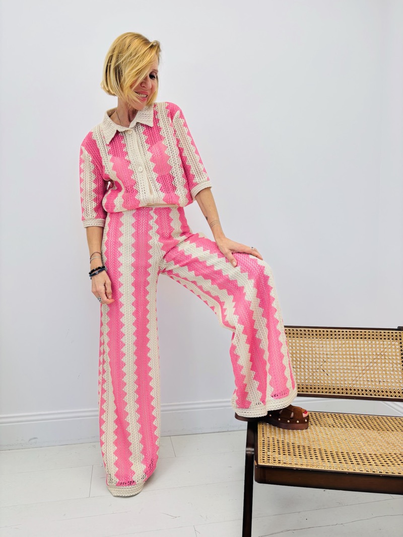 Ce pantalon large revisite l’esprit Missoni avec une touche estivale et moderne. Son motif rayé en maille crochet, mêlant rose vibrant et écru, apporte une forte identité visuelle et un effet texturé très tendance, idéal pour une sélection mode en boutique.