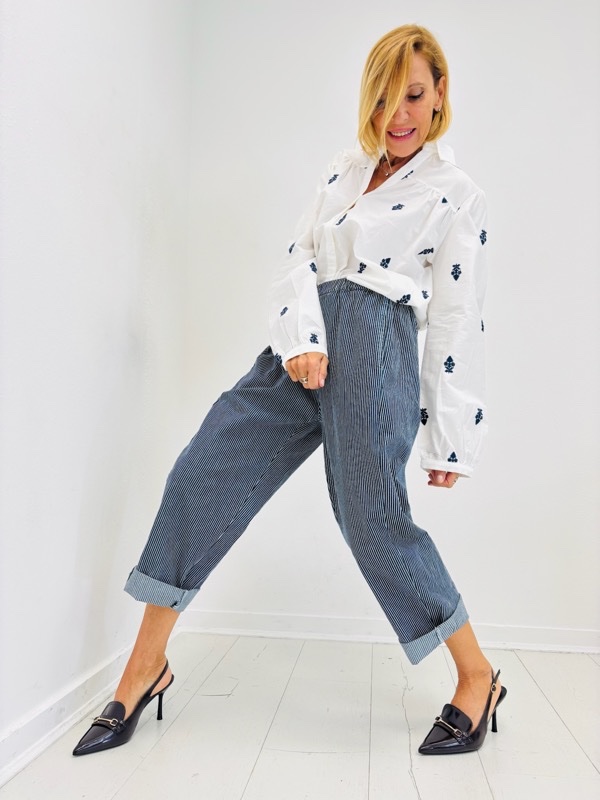 Les fines rayures apportent une touche graphique et moderne, parfait pour une tenue casual chic à porter aussi bien avec des baskets qu’avec des talons.