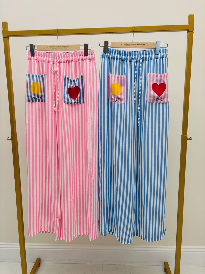 La taille élastiquée avec cordon de serrage permet un ajustement confortable et pratique. Les poches avant sont décorées de motifs brodés représentant un soleil et un cœur accompagnés des inscriptions “Sun” et “Love”, ajoutant une note ludique et estivale.